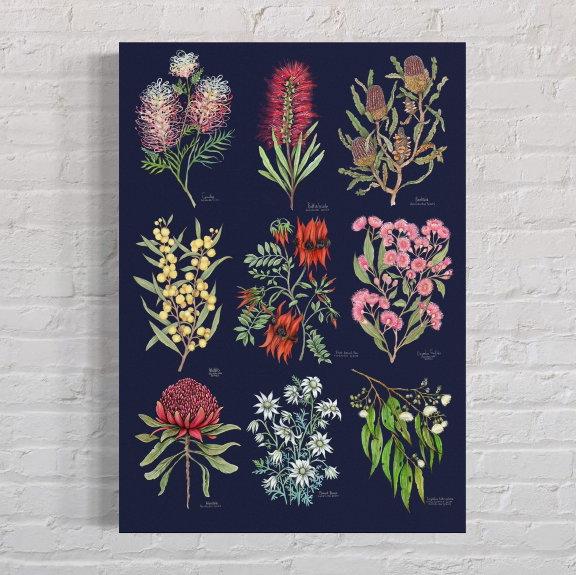 Grevillea, Bottlebrush, Banksia, Wattle, Sturt Desert Pea, Pink Flowering Gum, Waratah, Flannel Flower and Lemon Scented Gum.