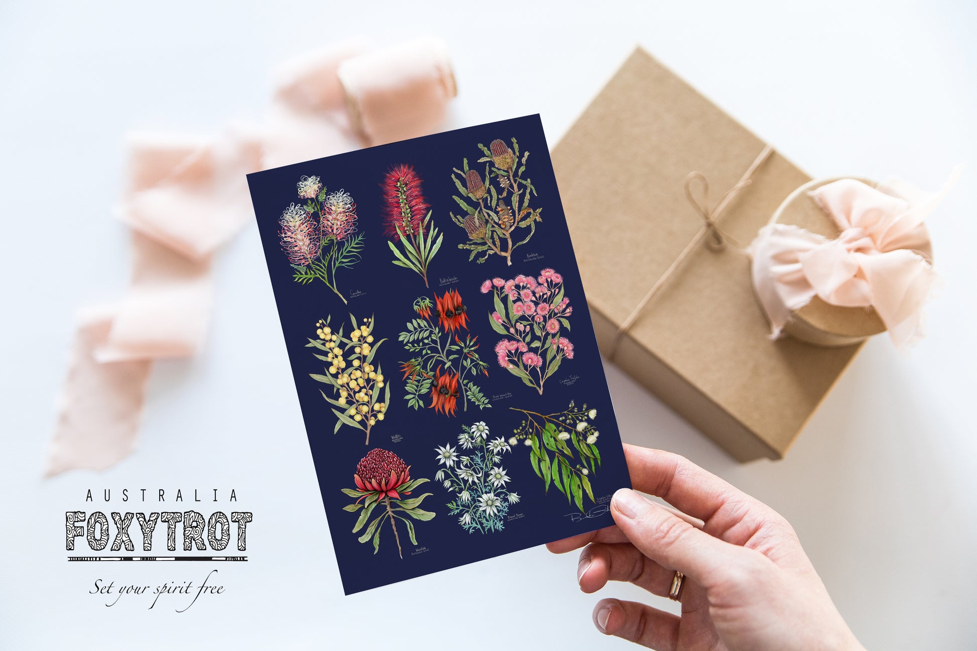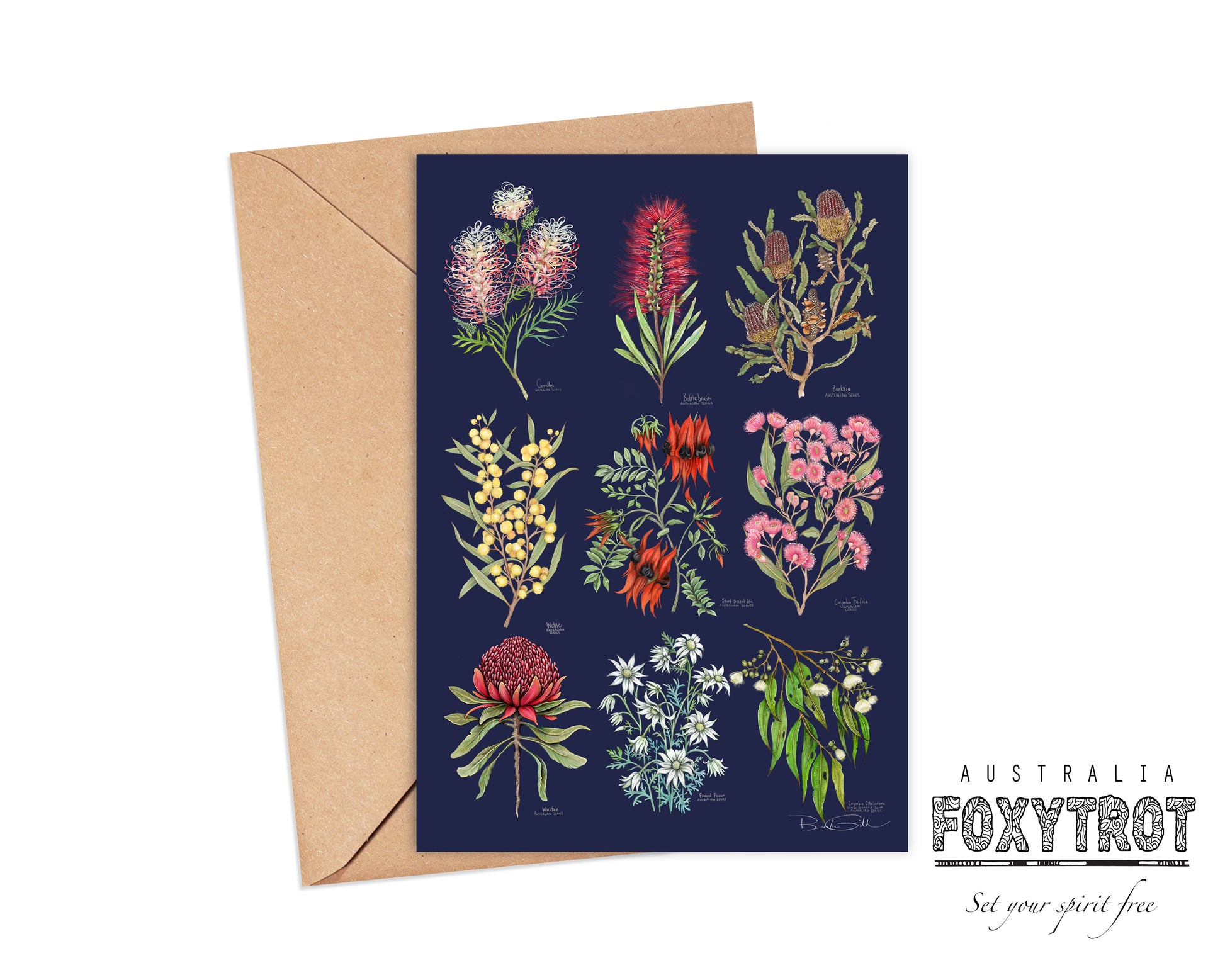 Grevillea, Bottlebrush, Banksia, Wattle, Sturt Desert Pea, Pink Flowering Gum, Waratah, Flannel Flower and Lemon Scented Gum.