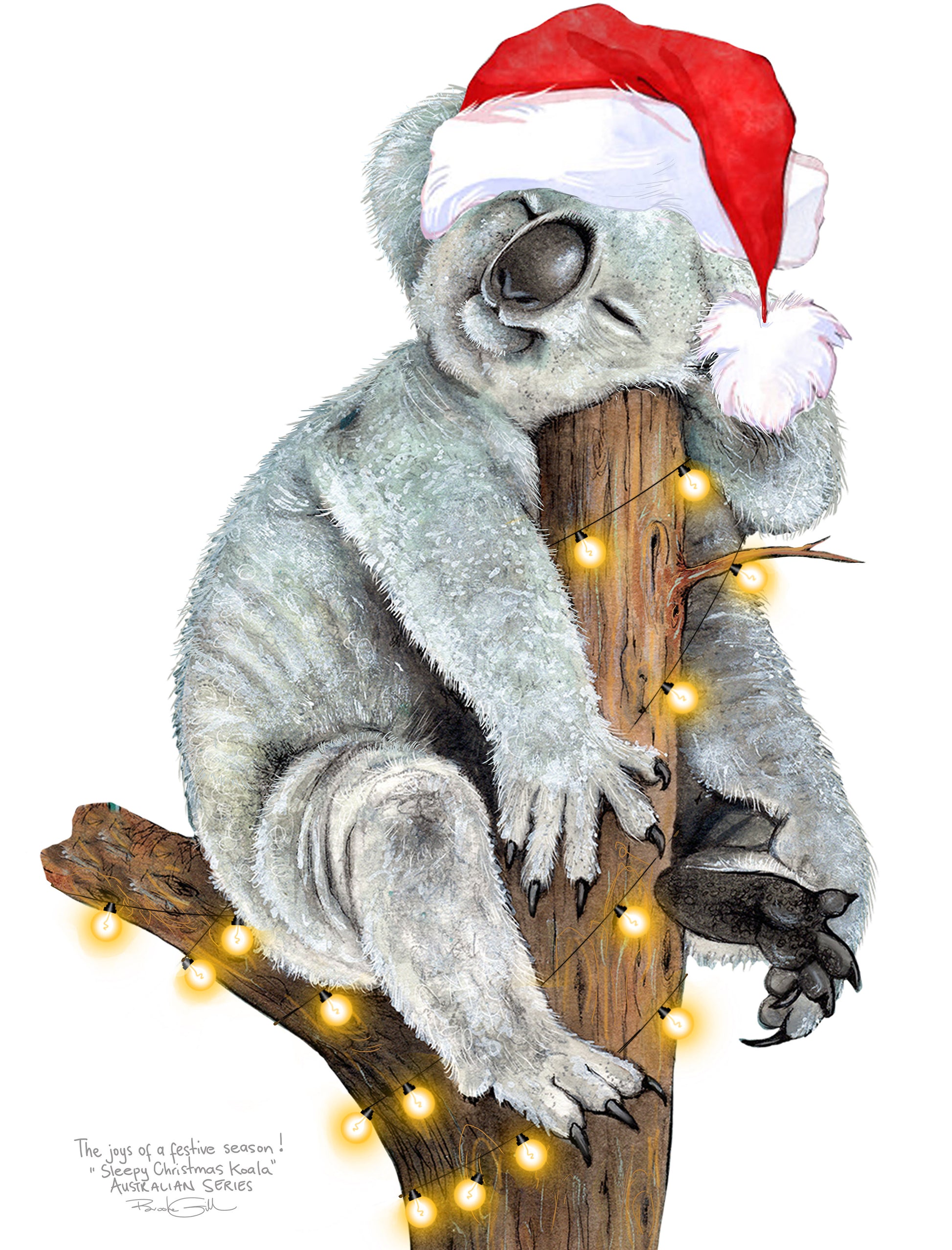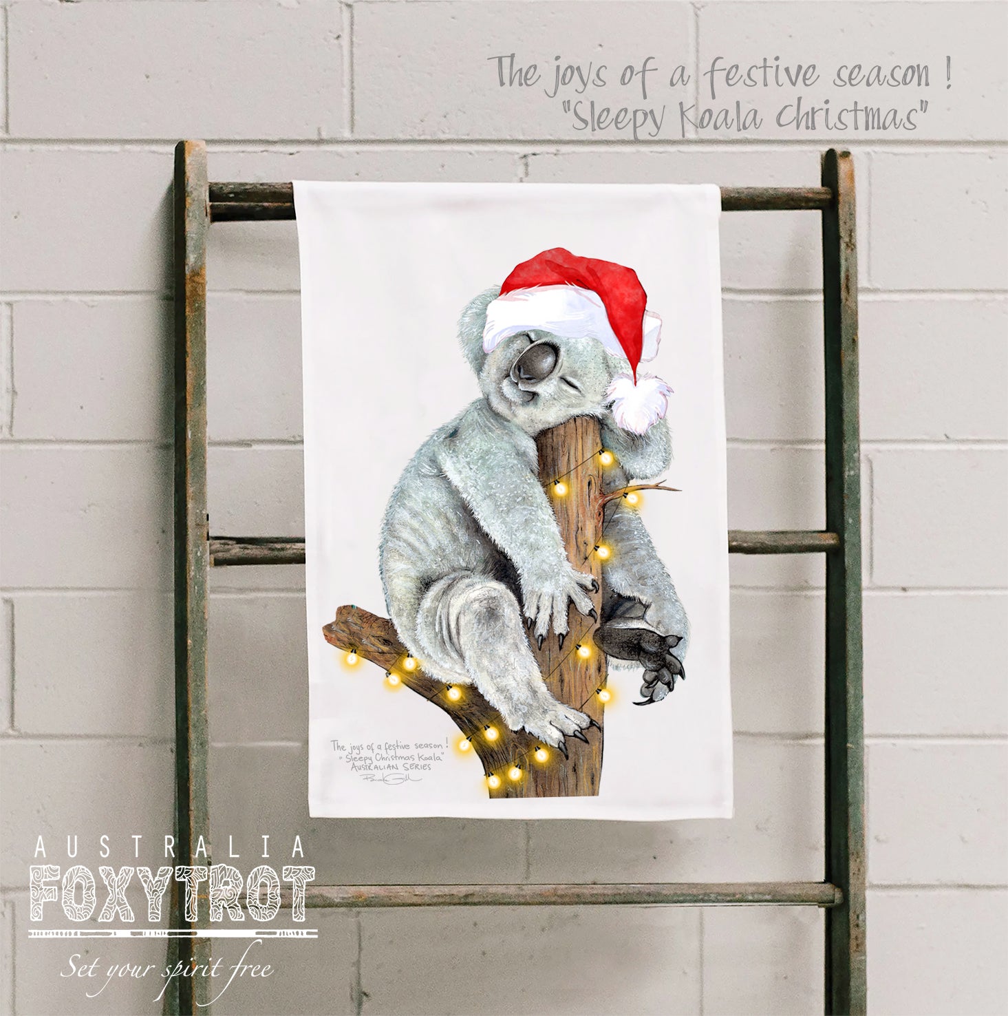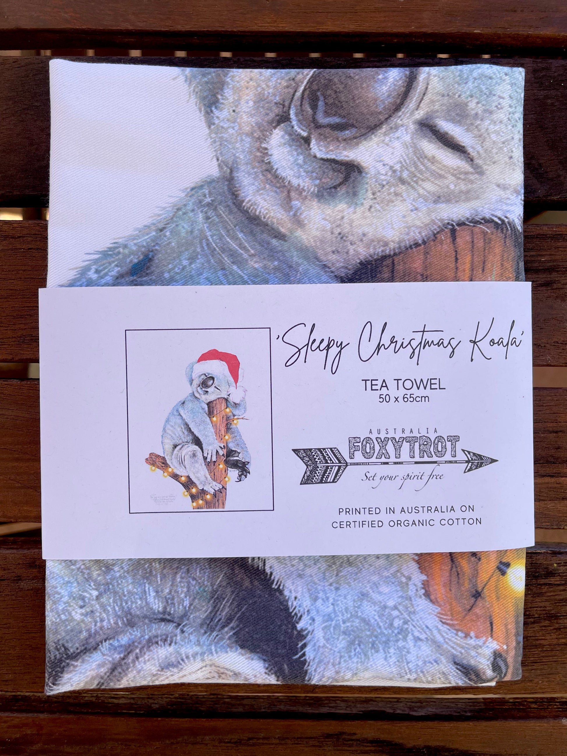 Welcome to my latest range of Certified Organic cotton tea towels, featuring my beautiful "It's oh so quiet" Koala illustration as a Christmas teatowel.