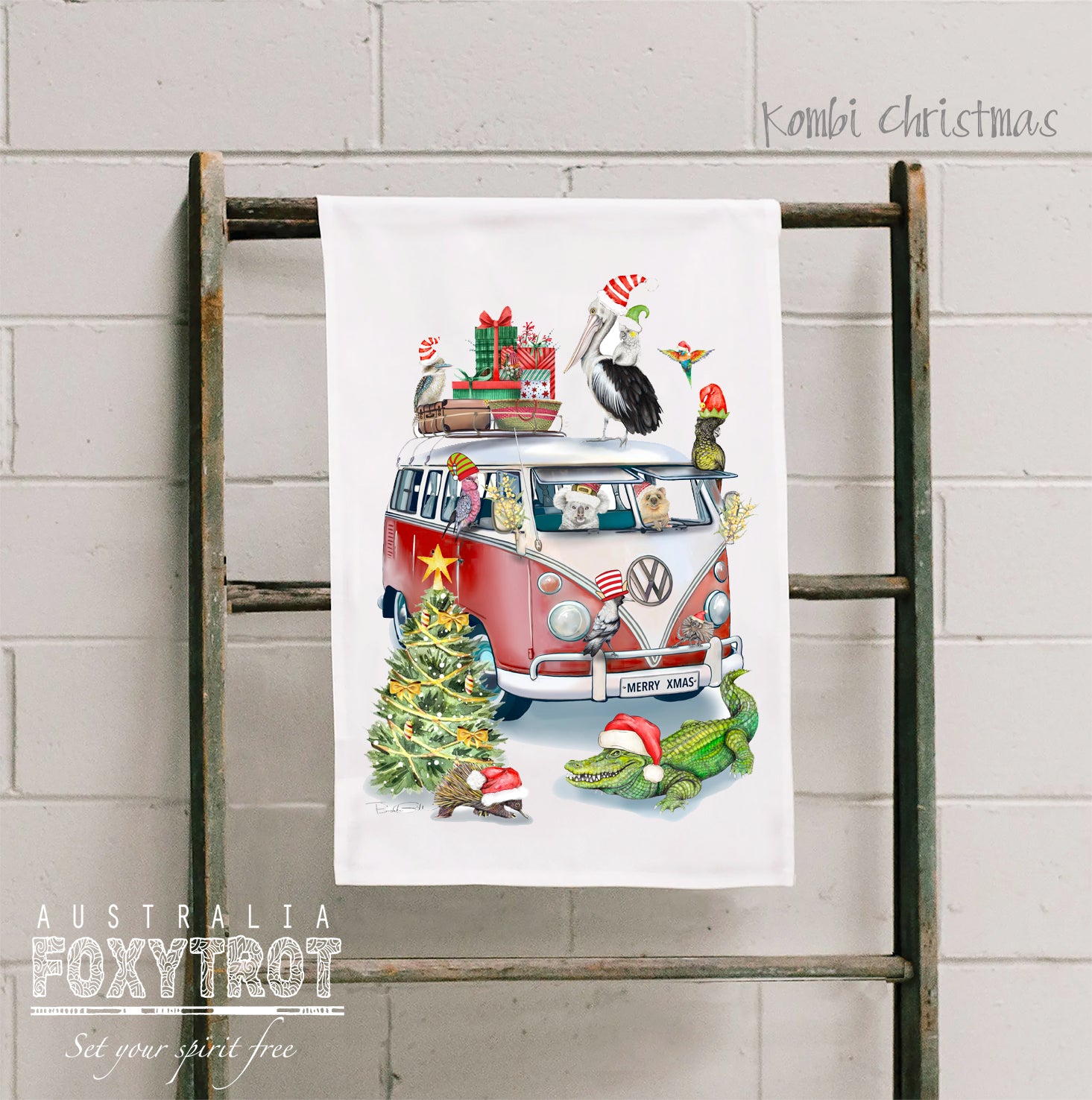 Welcome to my latest range of Certified Organic cotton tea towels, featuring my fun Kombi illustration as a Christmas teatowel.