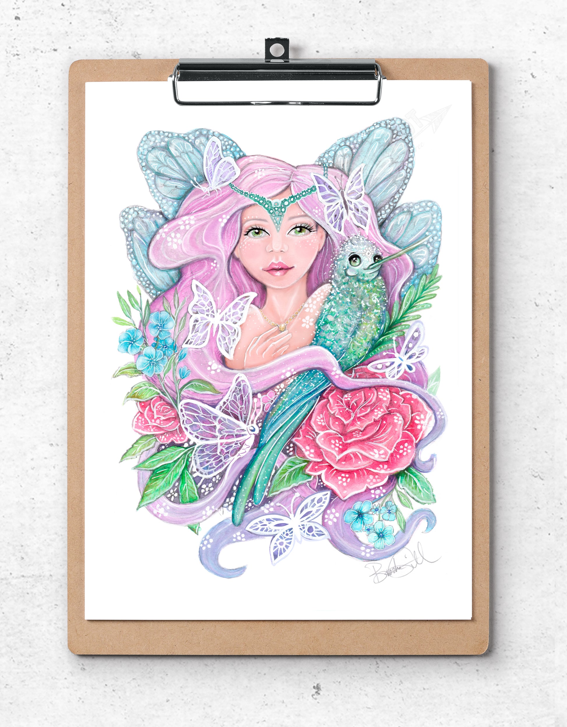 Her Long Tailed Hummingbird sits proudly with her ruling the kingdom of Fairies. With Butterflies galore.