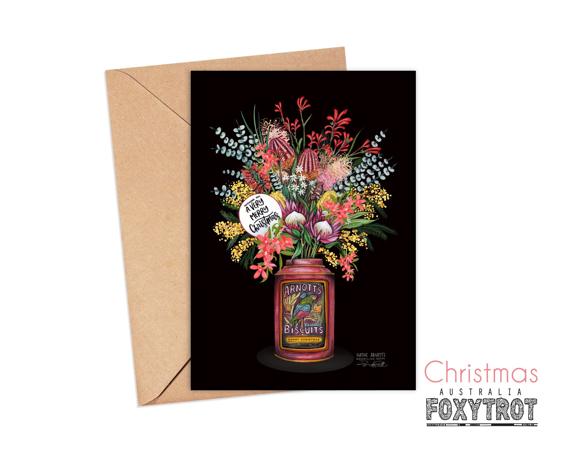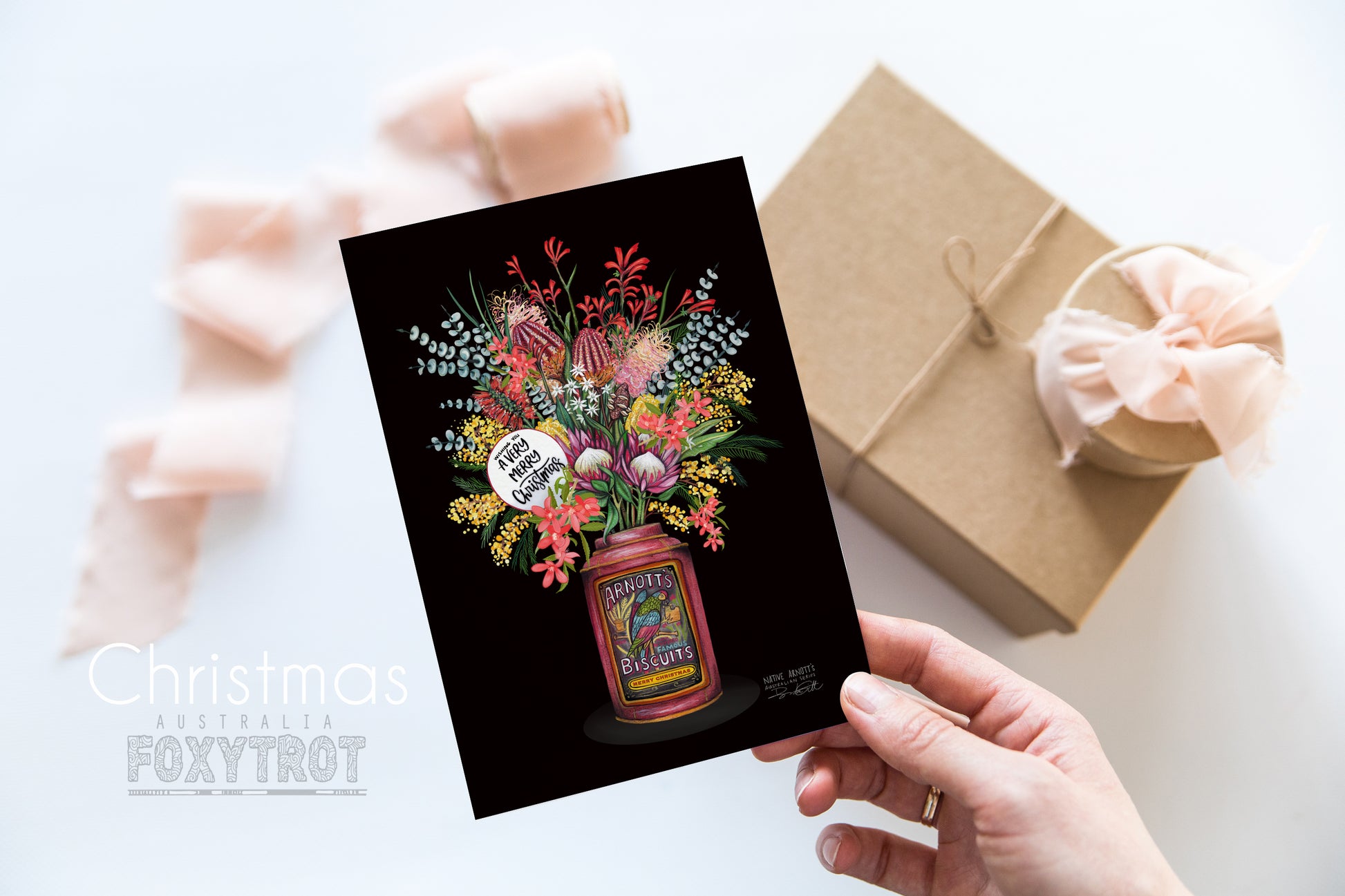 Welcome to my latest illustration of a vintage Arnotts tin as a Christmas Card. I added some Christmas bush to the bunch of Wattle, Banksia's, Kangaroo Paw, Protea's and native Eucalyptus.