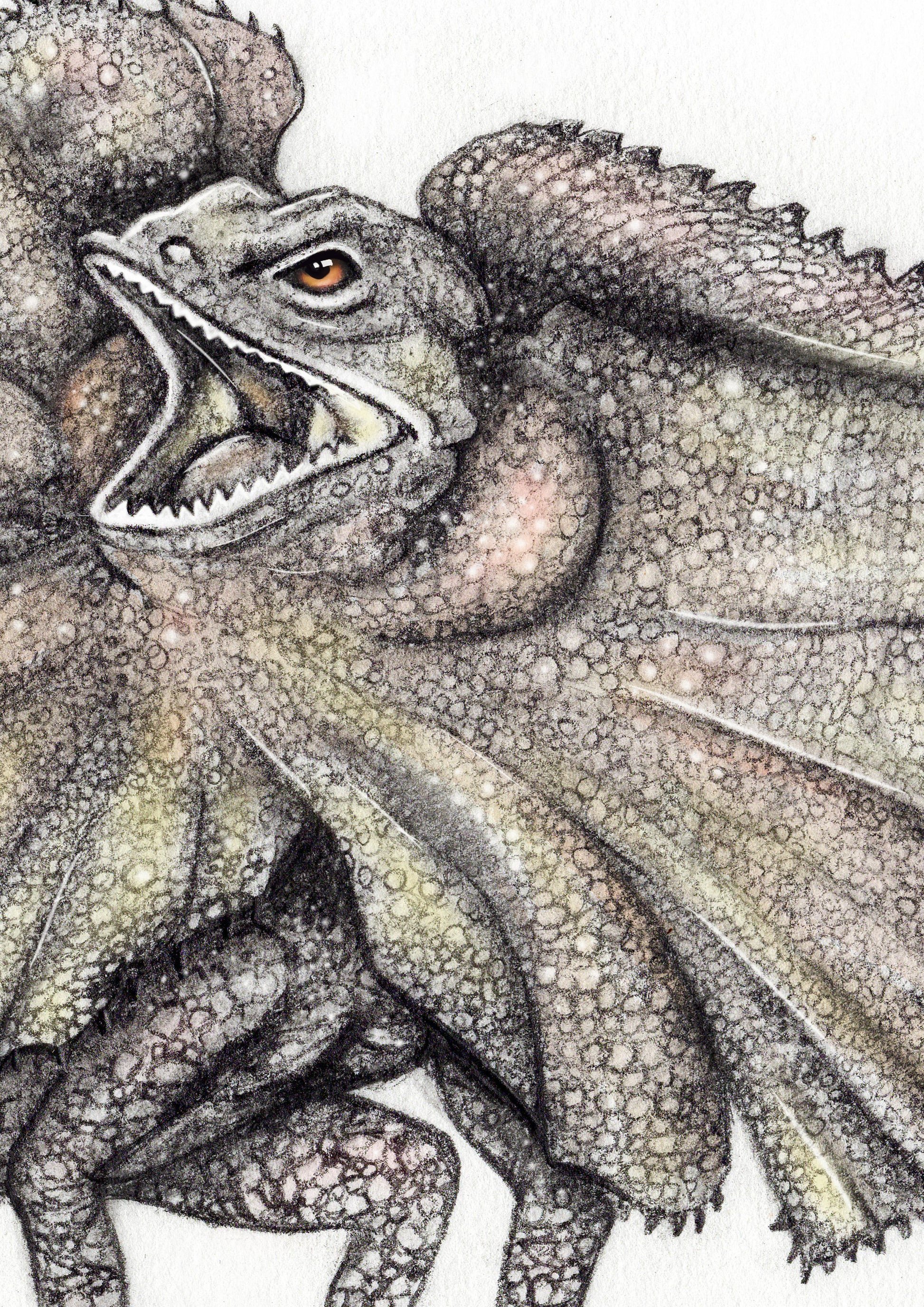 When the Frill Neck is faced with danger, it lifts its front legs (to appear bigger), unfolds its frill and opens it’s big ugly mouth. They may even hiss or spit whilst standing up on their hind legs.