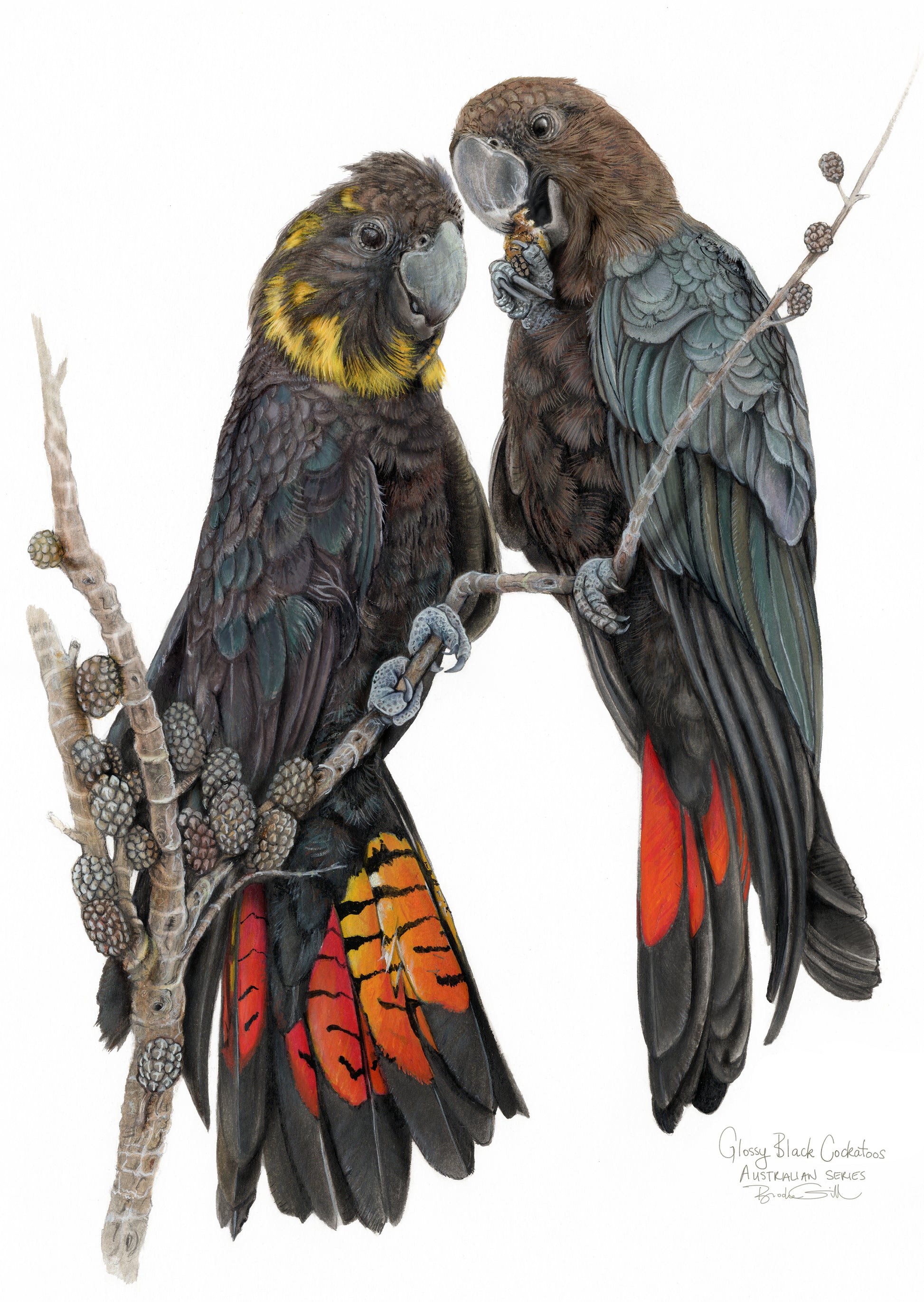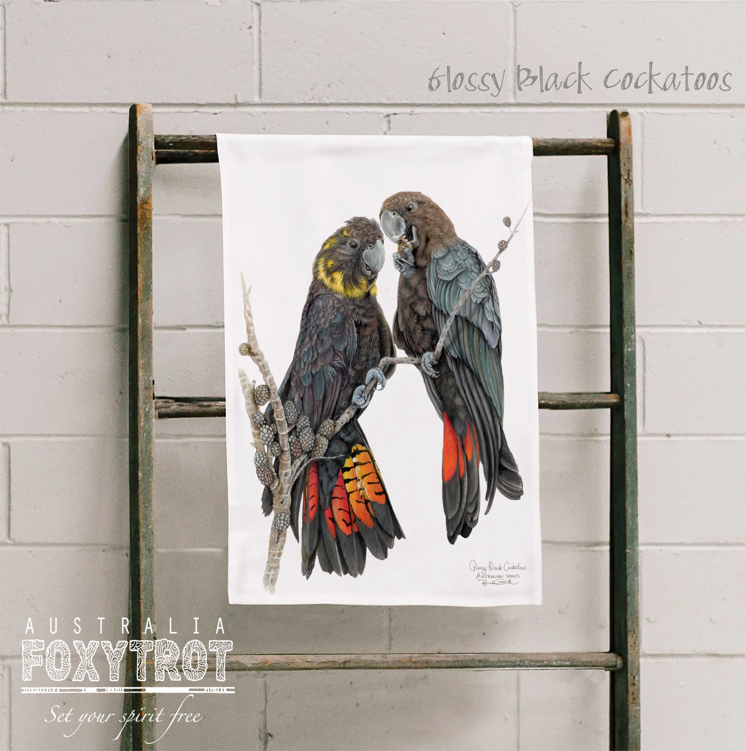 Welcome to my latest range of Certified organic cotton tea towels, featuring my original watercolour artwork of two rare Glossy Black Cockatoos.