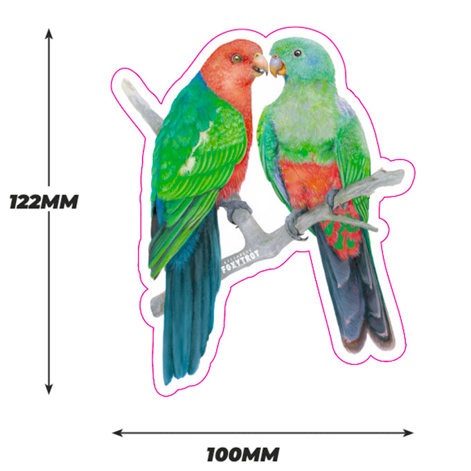 King Parrot lovebirds sticker measures 12.5cm height by 9.2cm width.