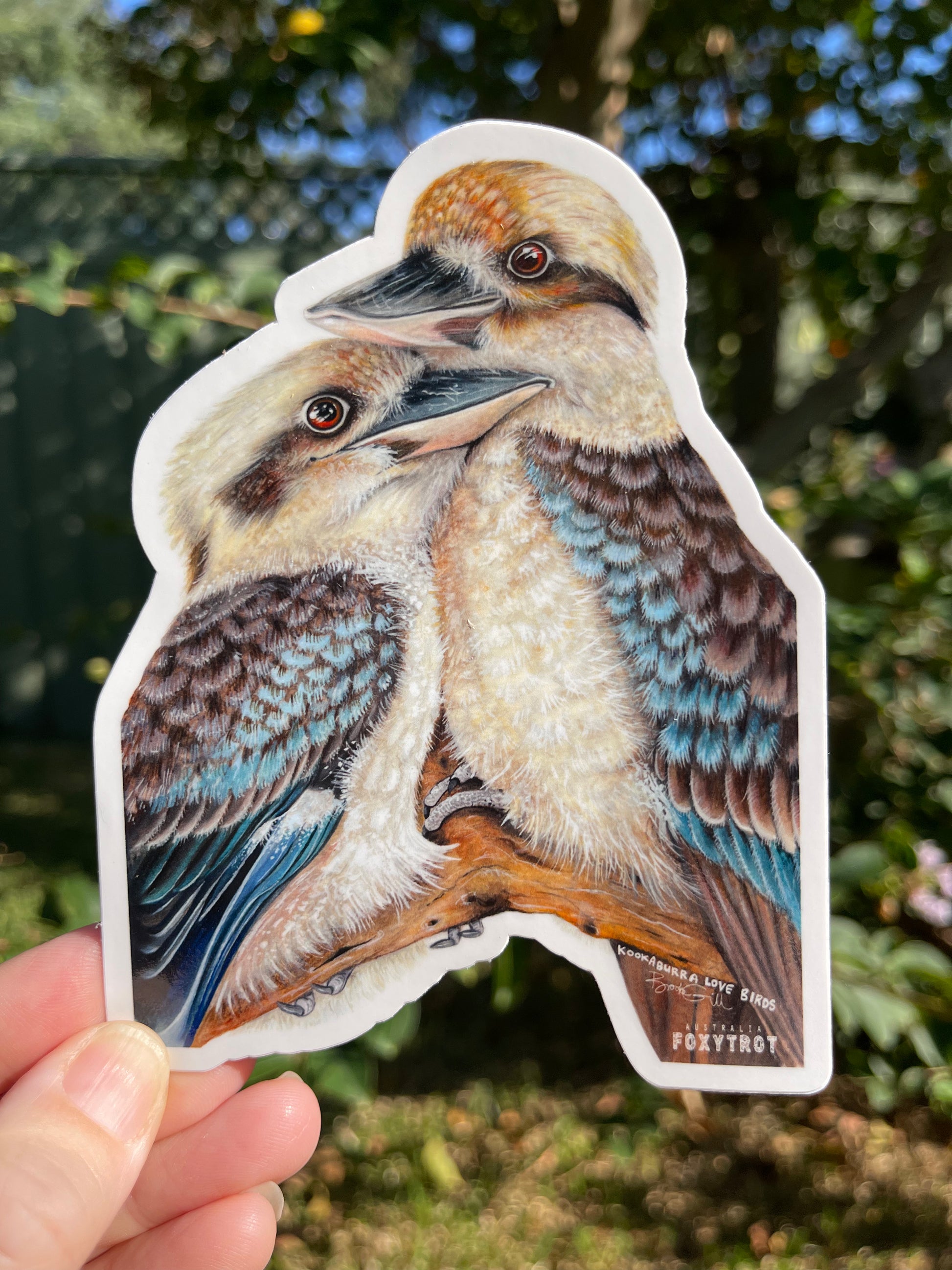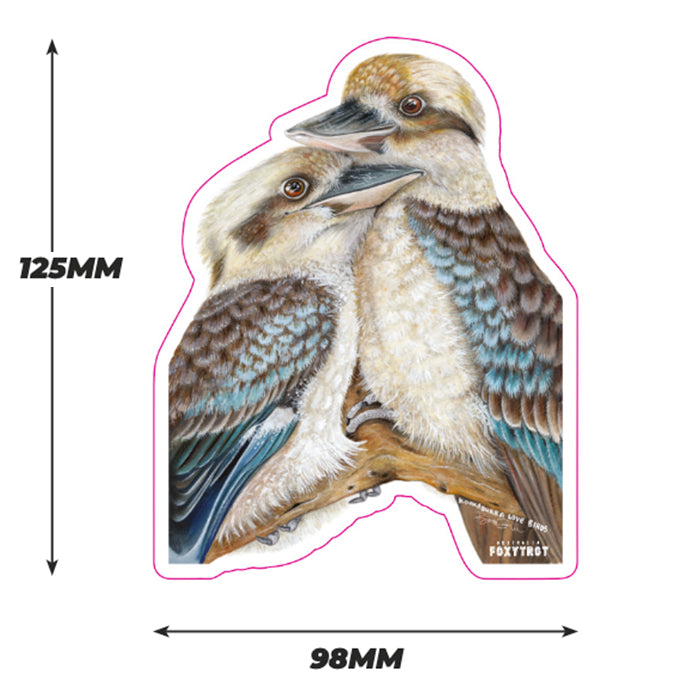Kookaburra Lovebirds sticker measures 12.5cm height by 9.8cm width.