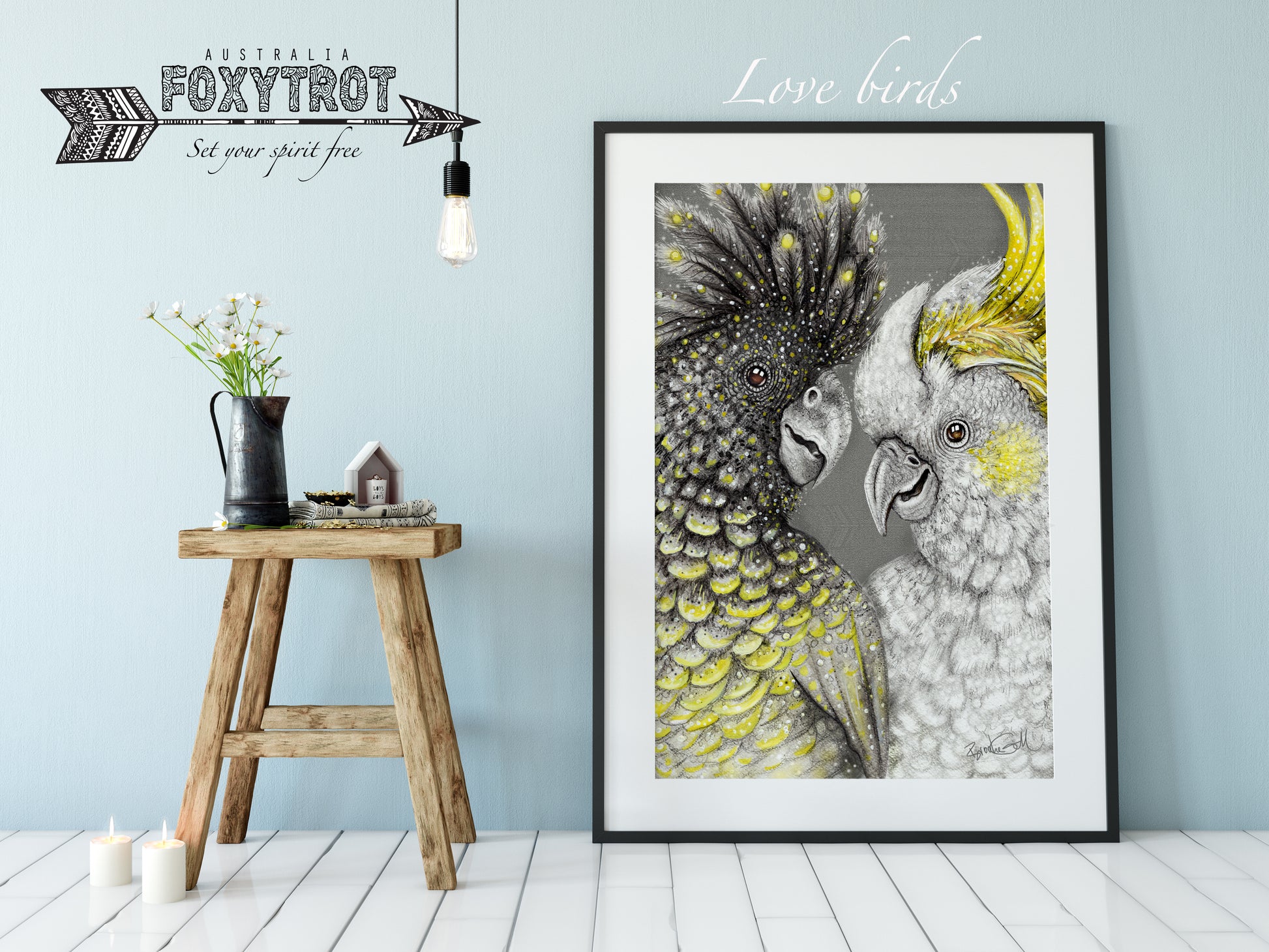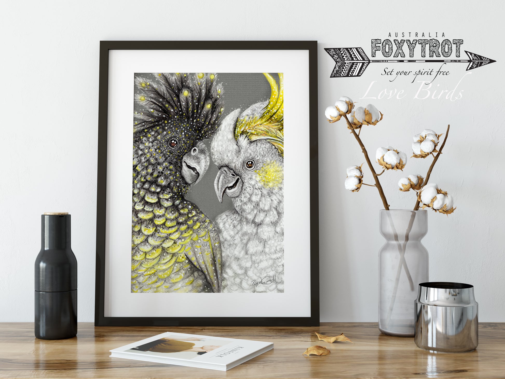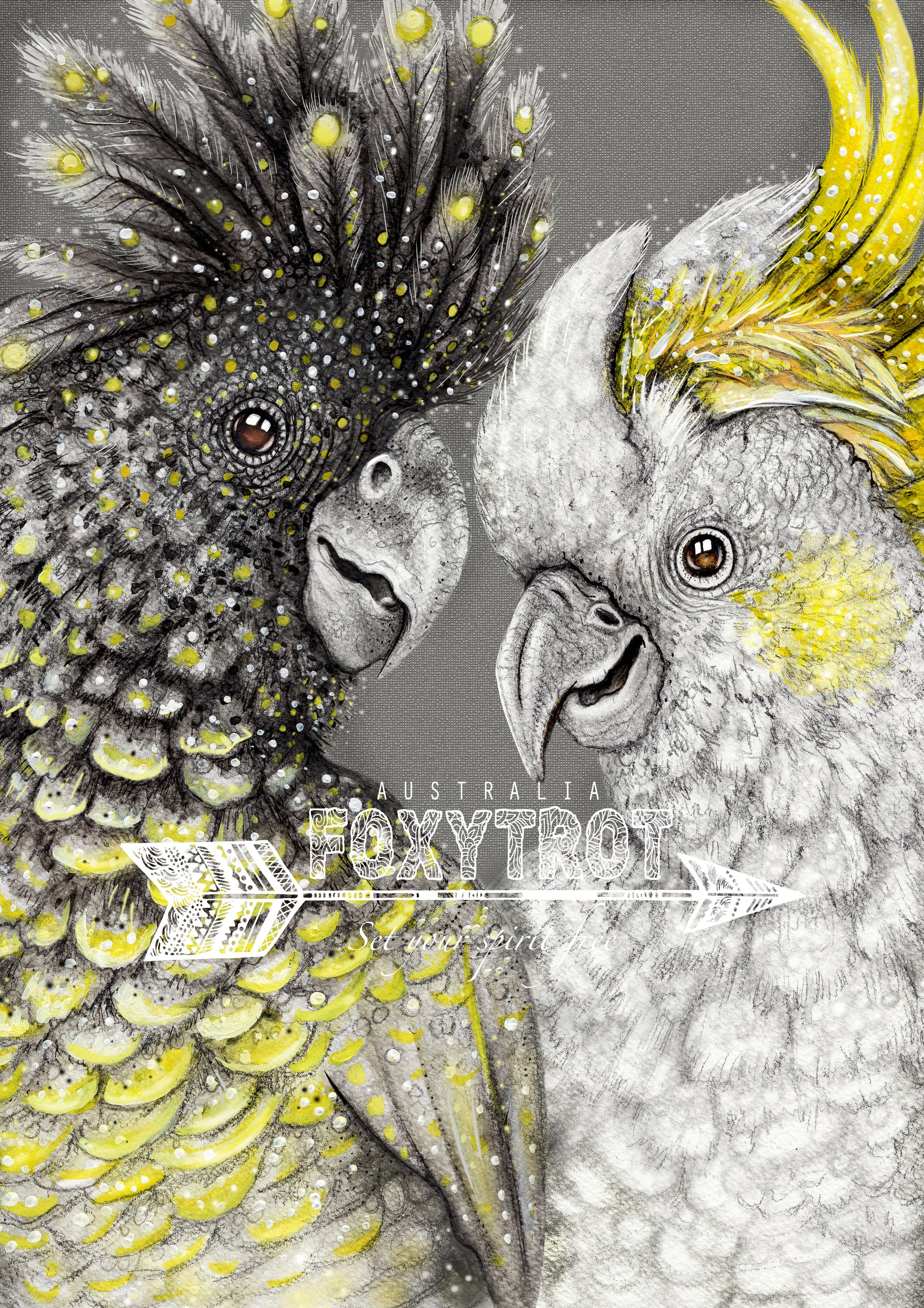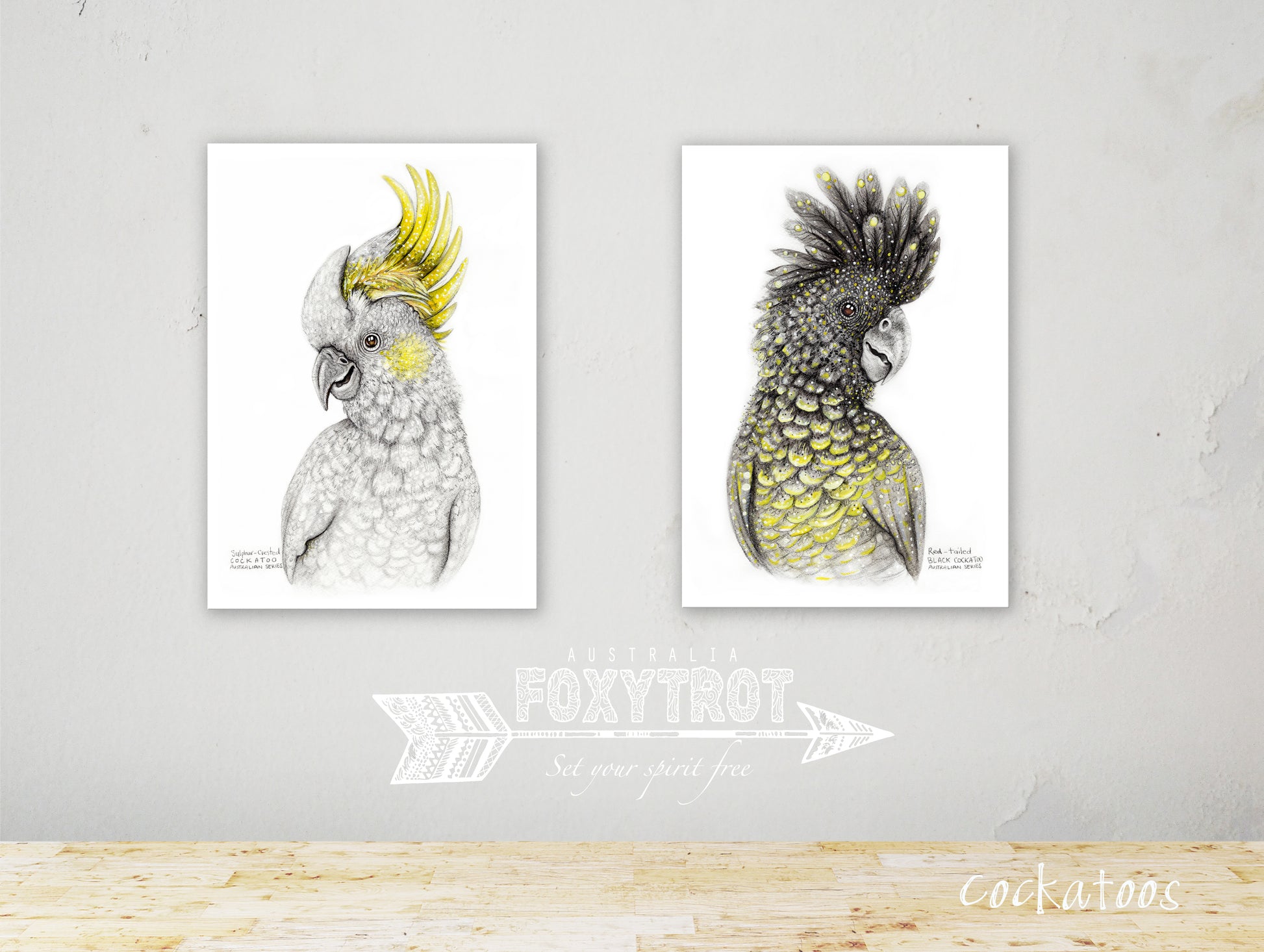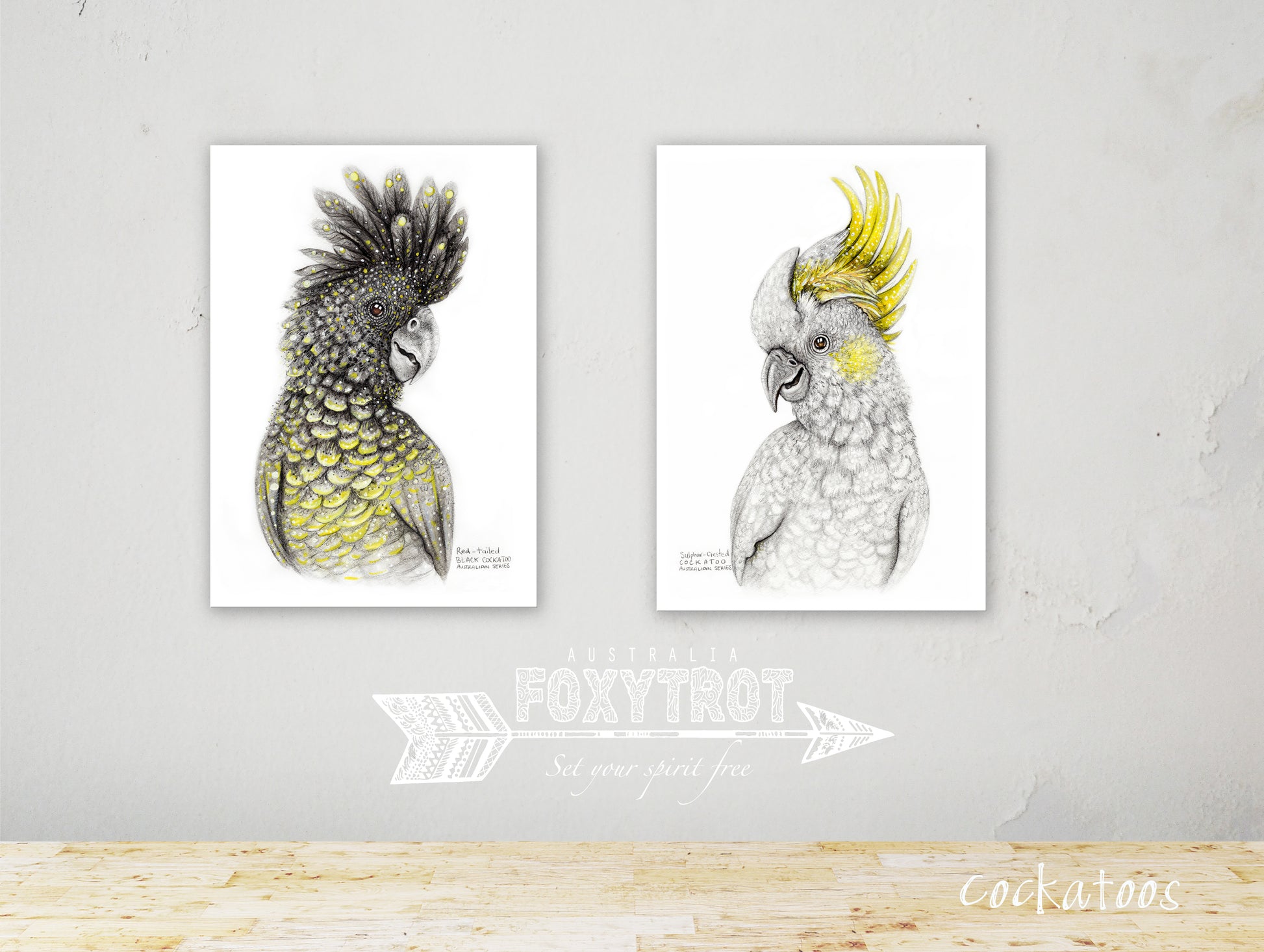 Originally drawn seperate, the Black Cockatoo was always drawn to compliment the White. So I thought it would look magical with them both on the same page.