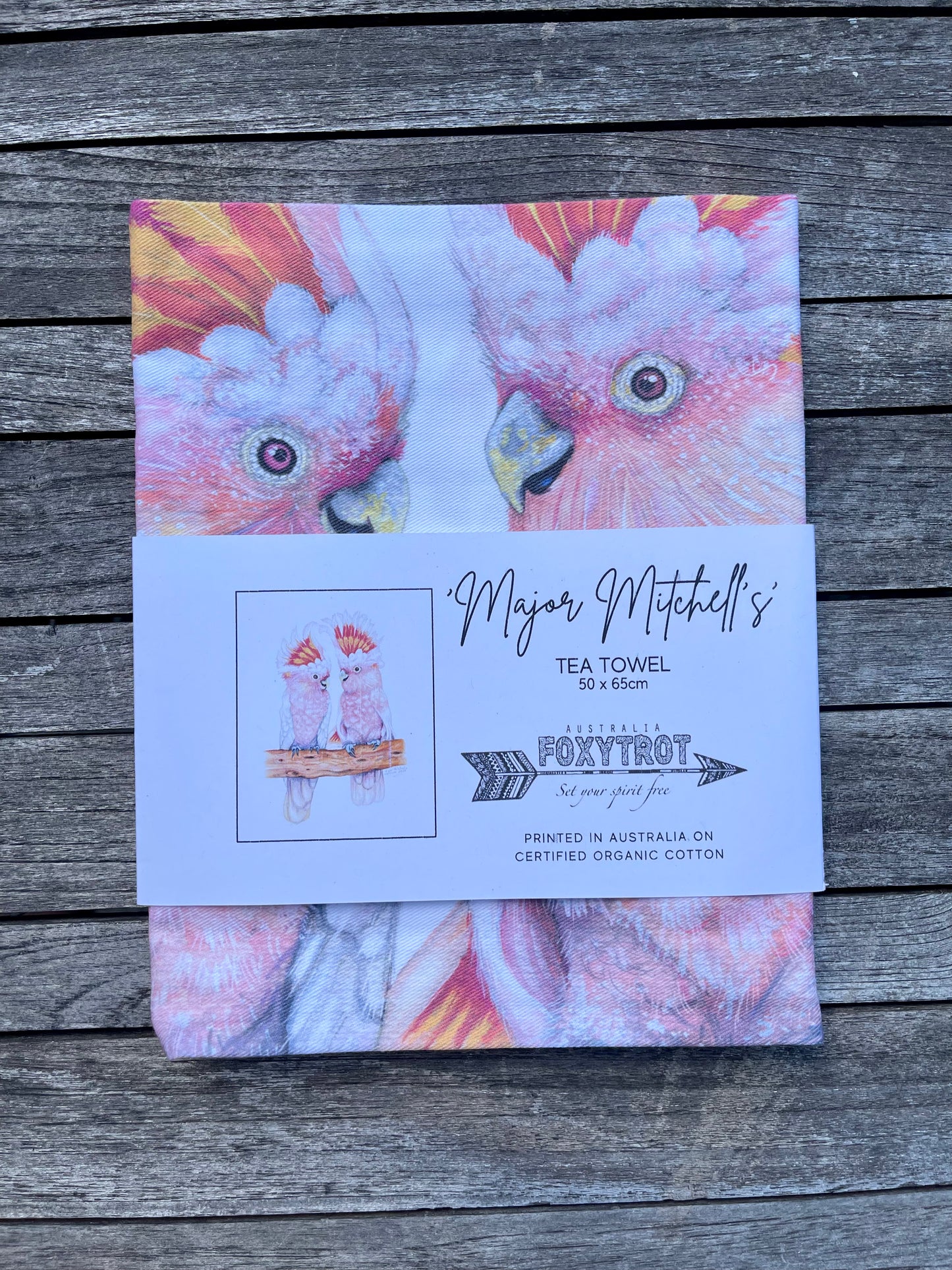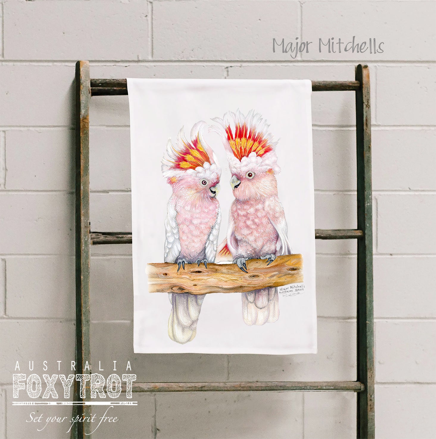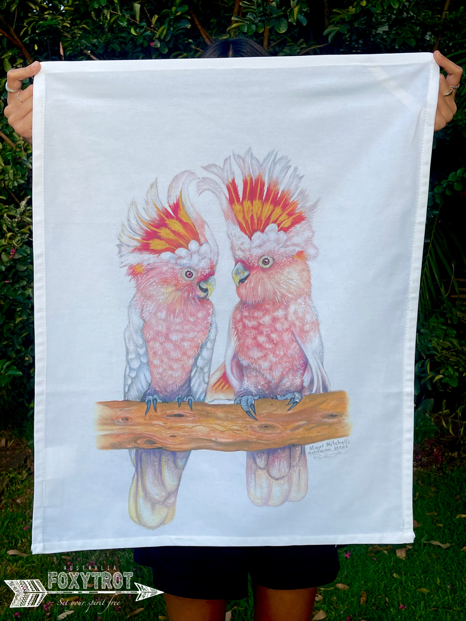 Welcome to my latest range of Certified Organic cotton tea towels, featuring my original watercolour artwork of tan adorable Major Mitchell couple.