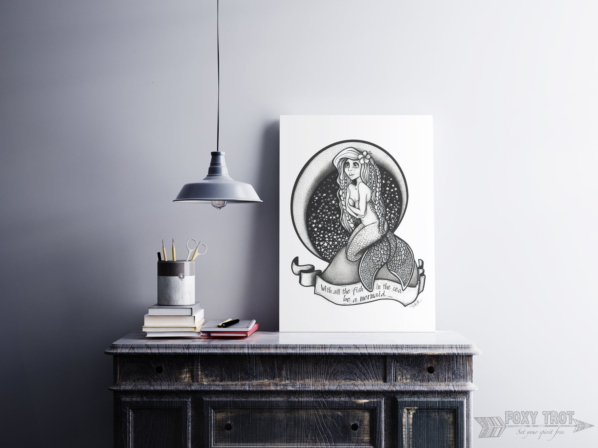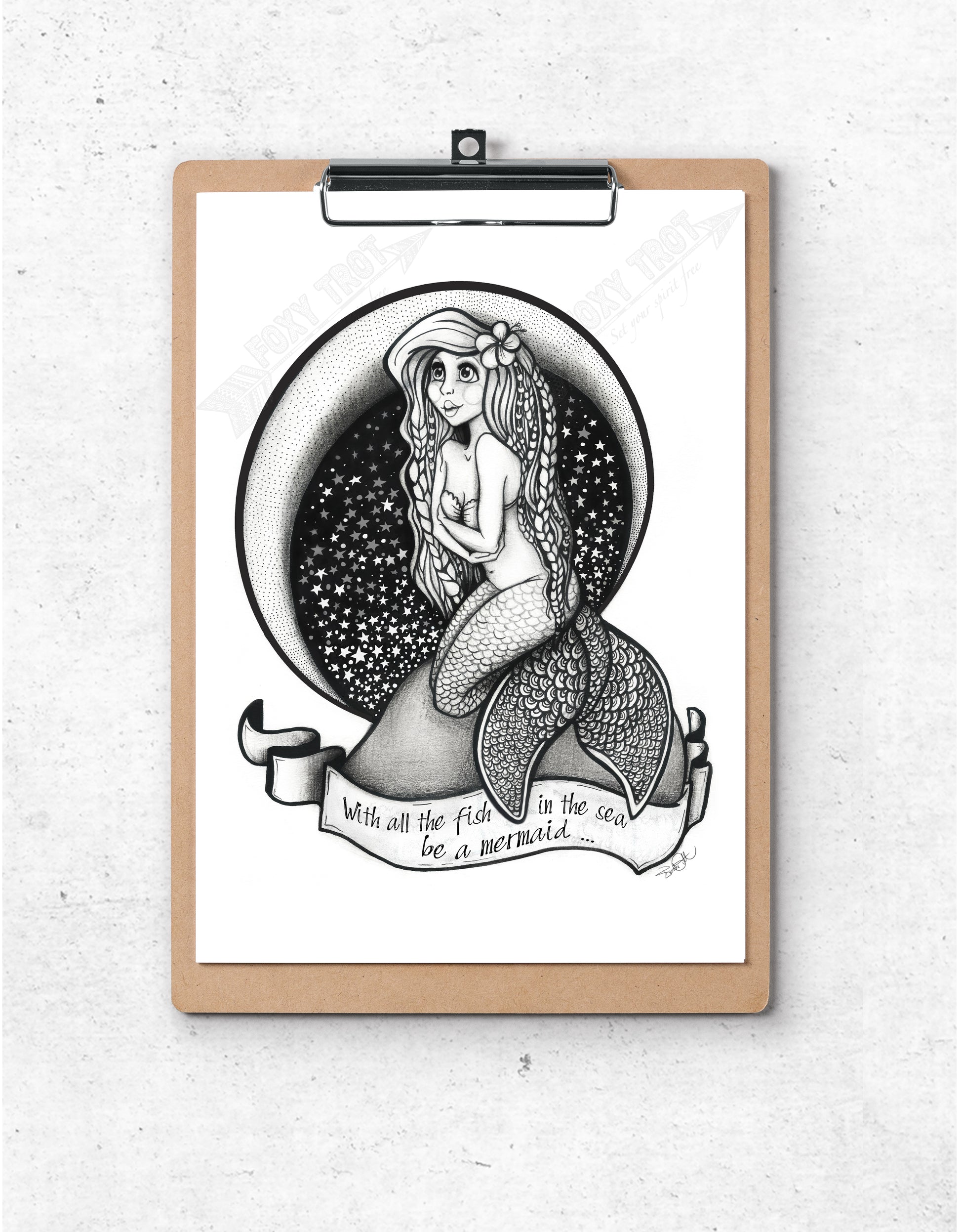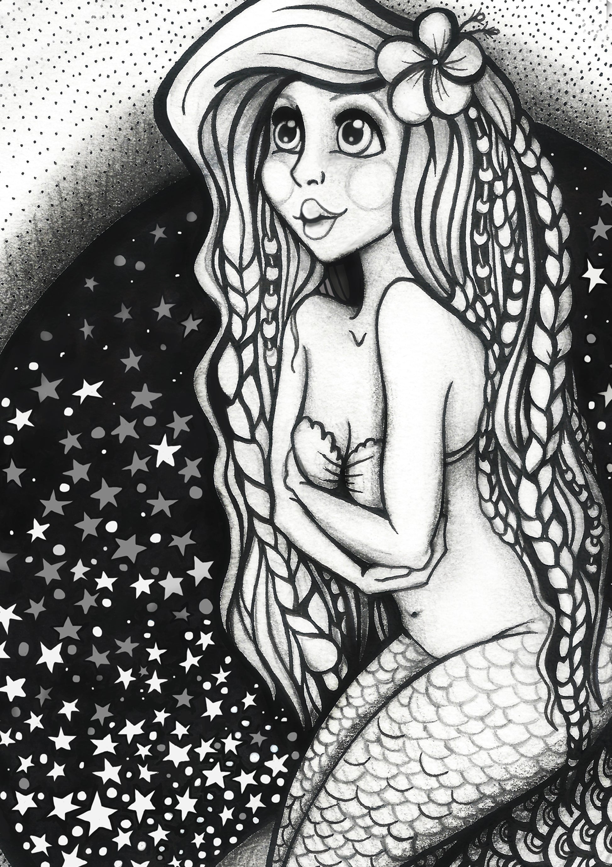 Bathing in the moonlight my gorgeous Hawaiian Mermaid was created using pencil and Ink. She teaches us to be unique and special.