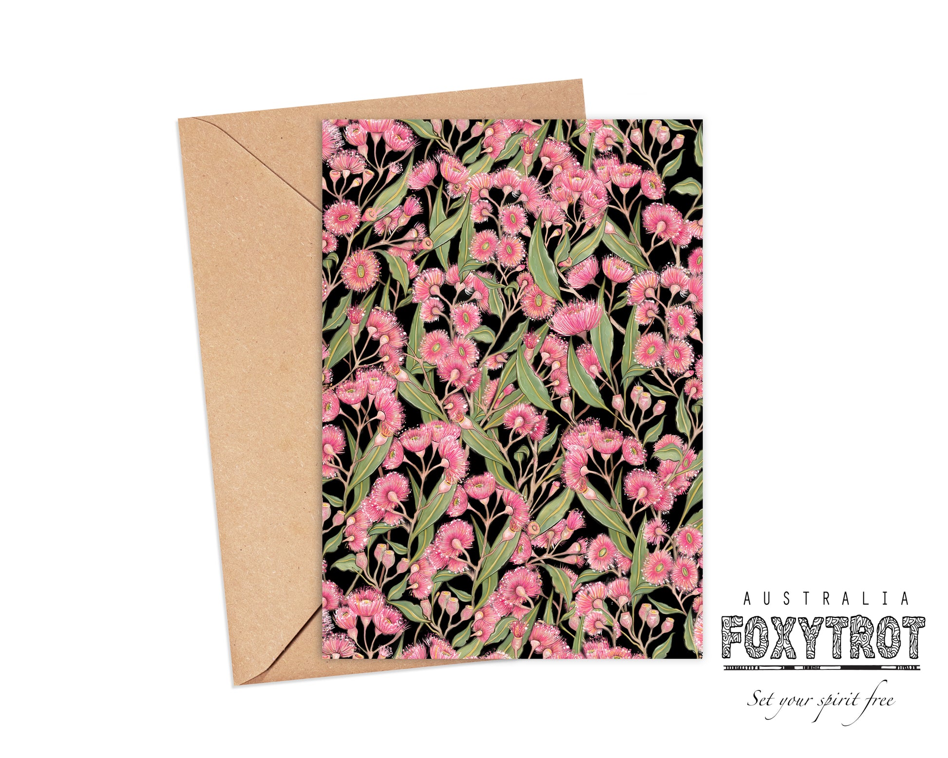 Welcome to my Stunning Repeating Patterned Flowering Gum illustration as a greeting card. Hand drawn then digitally composed into a repeating patten.