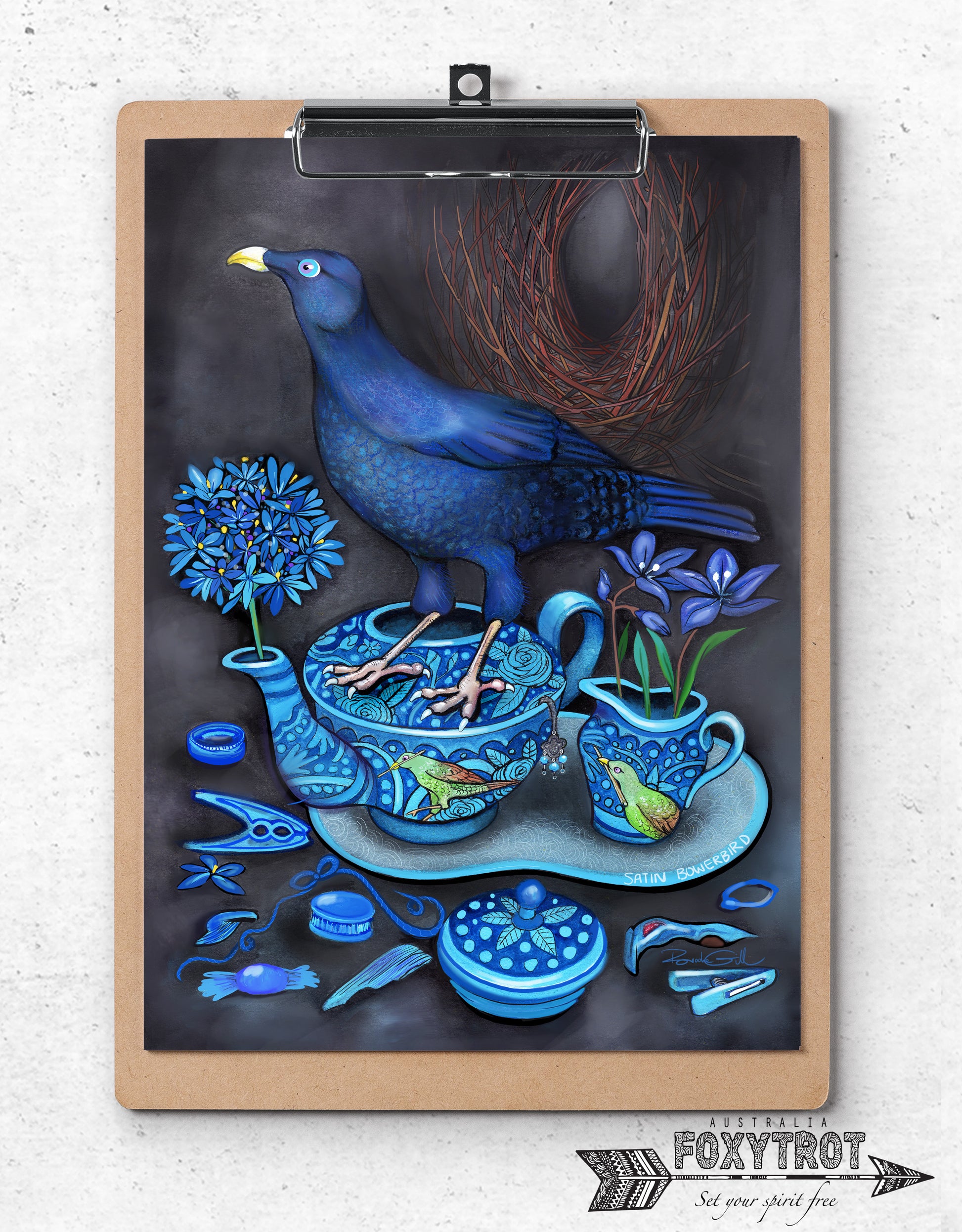 This piece came about because my darling Aunt and Uncle from Gerringong shared the delight over a cup of tea that they have a satin bowerbird taking a liking to their backyard. Fascinated and intrigued I have used my Uncle Bob’s photos of both the male and his two females “friends”. Also the objects all around the bower were incredible. Pegs, milk tops, string even an Oreo wrapper.