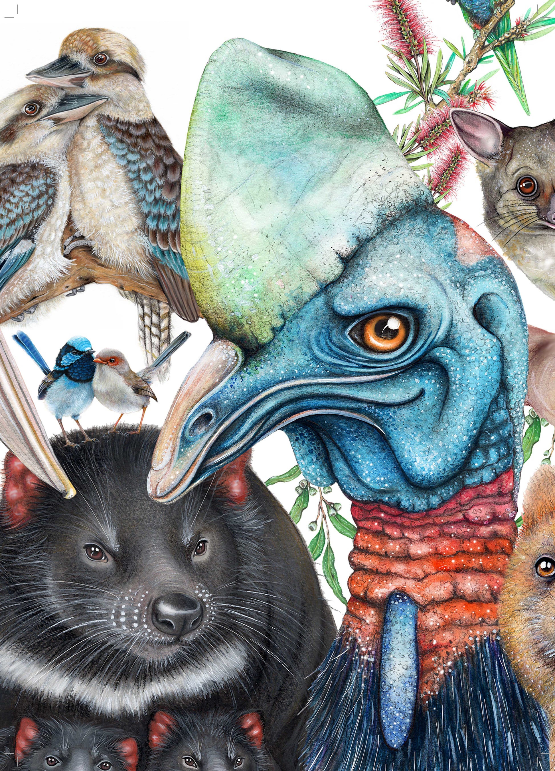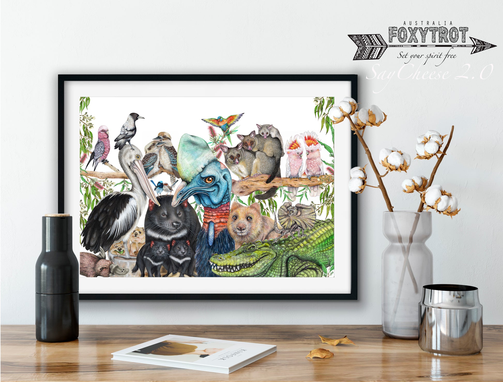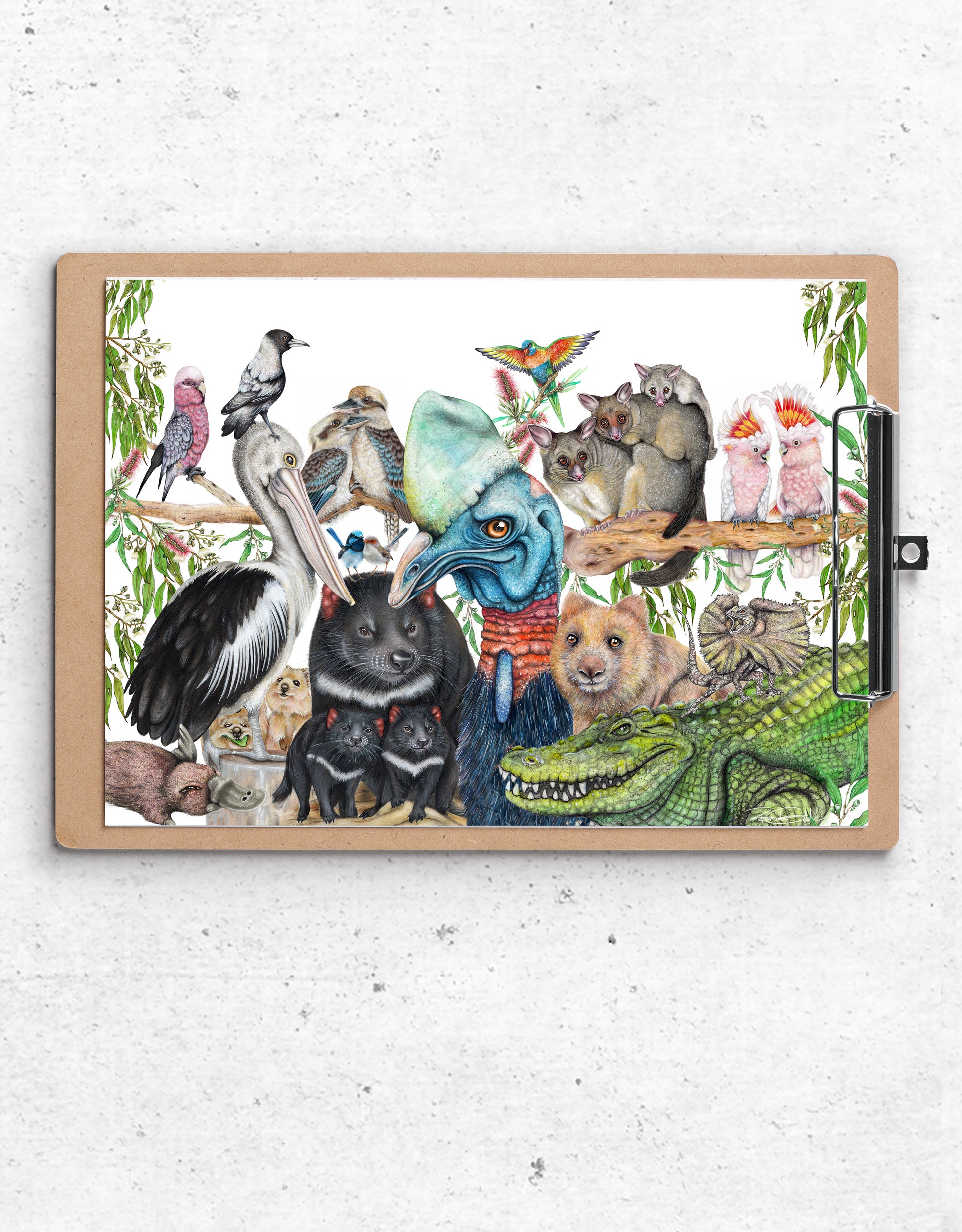 So after the original Say cheese group photo I have drawn many more animals since. This time the cassowary is front and centre and he isn't too impressed to have his photo taken. The frill neck lizard cruises in on the crocodile, that is very happy to have his photo taken as he is thinking the photographer is his lunch!!!!. The platypus is swimming in and the kookas are too besotted with each other to notice whats going on! The quokkas are peeking through the legs of the Pelican and the Fairy Wrens are so small, that if you blinked, you would miss them.