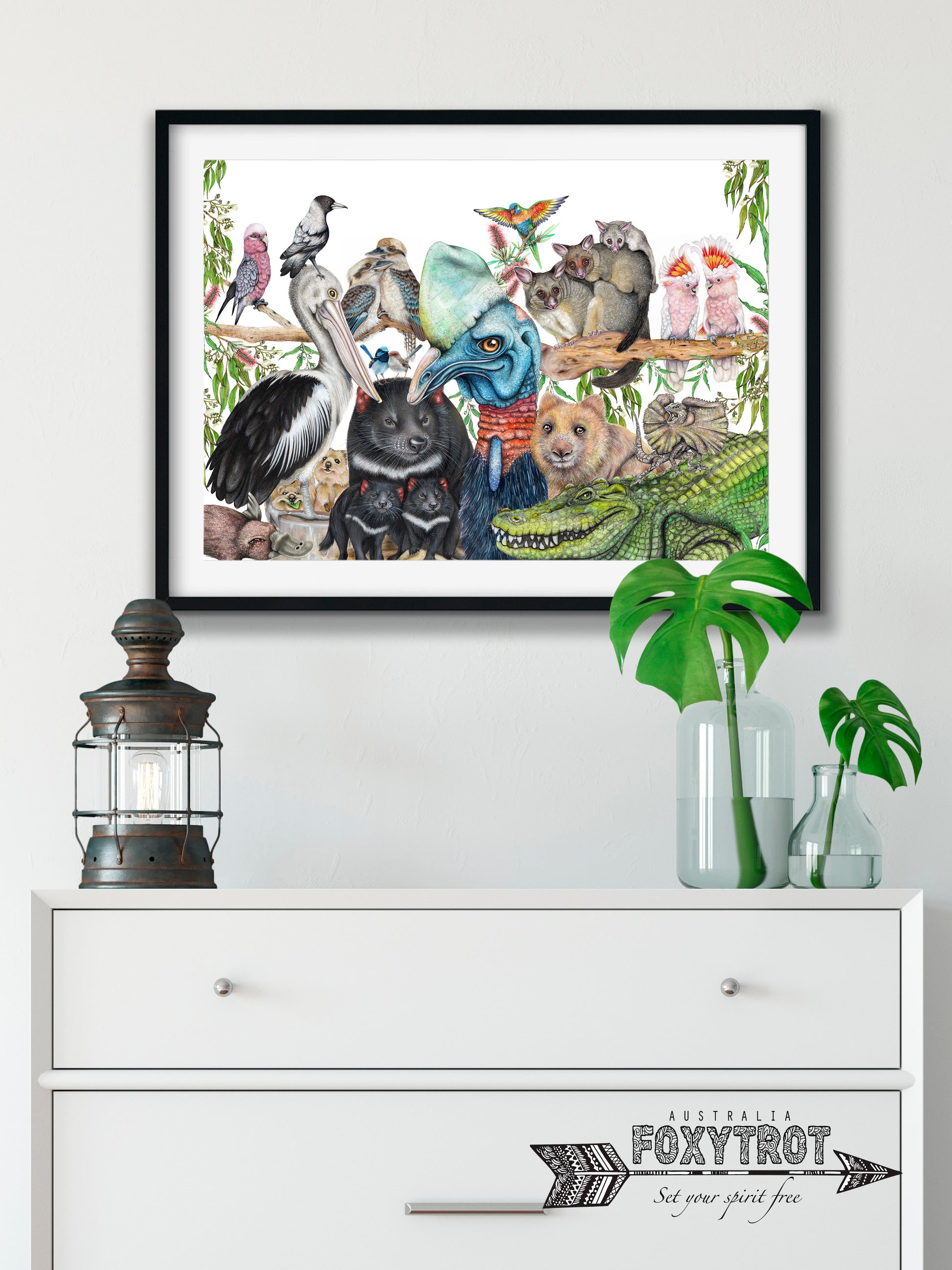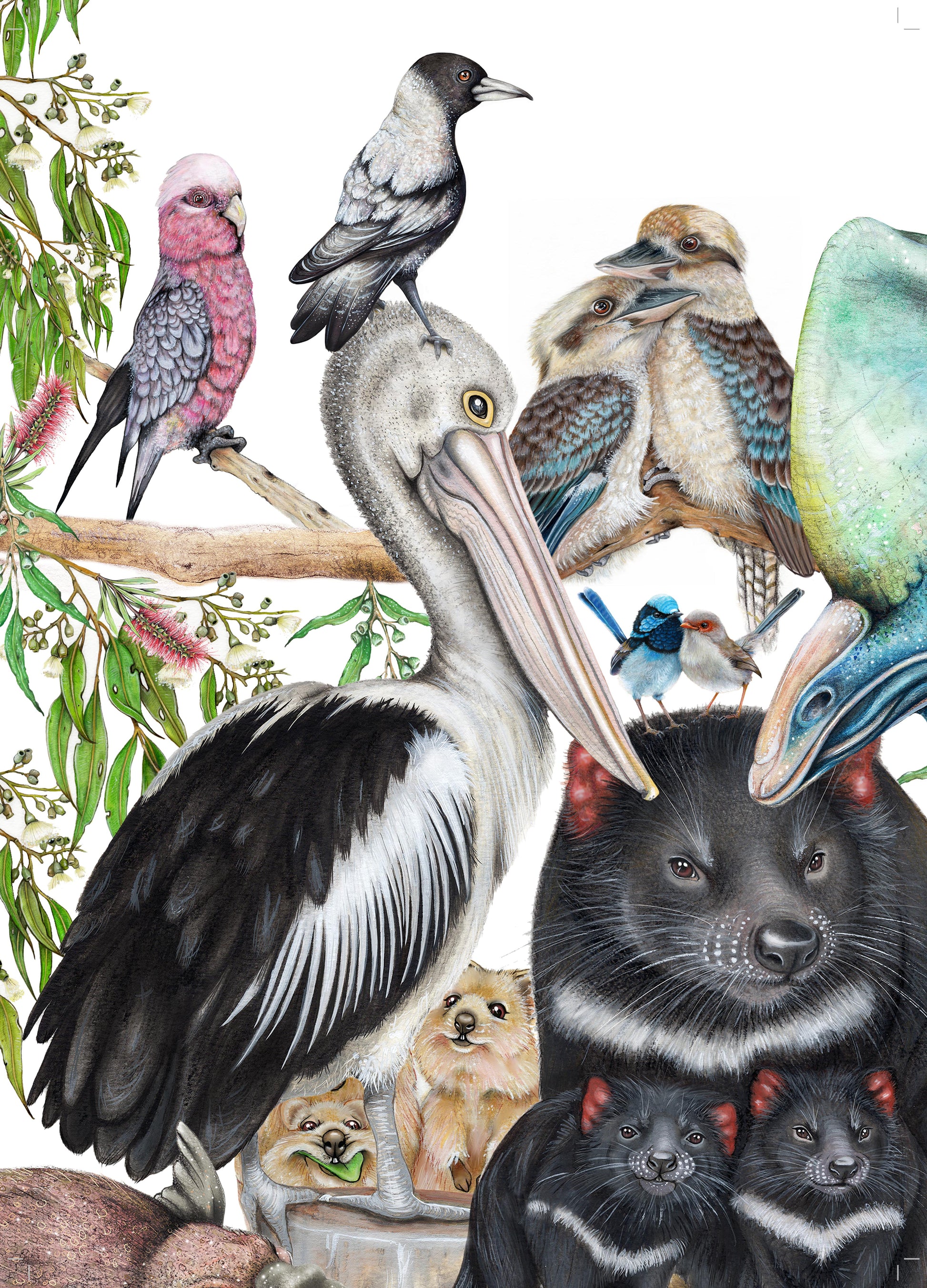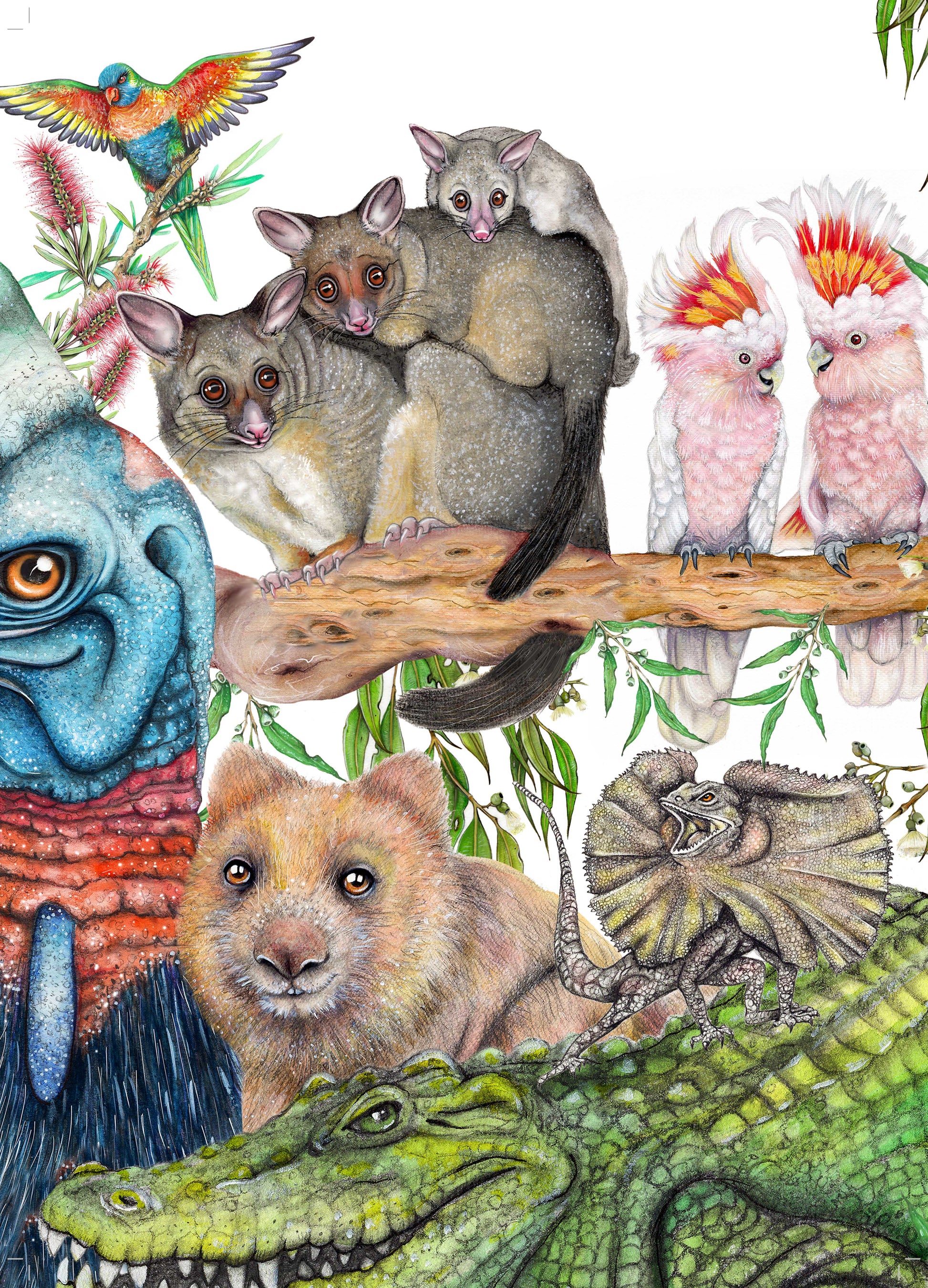 So after the original Say cheese group photo I have drawn many more animals since. This time the cassowary is front and centre and he isn't too impressed to have his photo taken. The frill neck lizard cruises in on the crocodile, that is very happy to have his photo taken as he is thinking the photographer is his lunch!!!!. The platypus is swimming in and the kookas are too besotted with each other to notice whats going on! The quokkas are peeking through the legs of the Pelican and the Fairy Wrens are so small, that if you blinked, you would miss them.