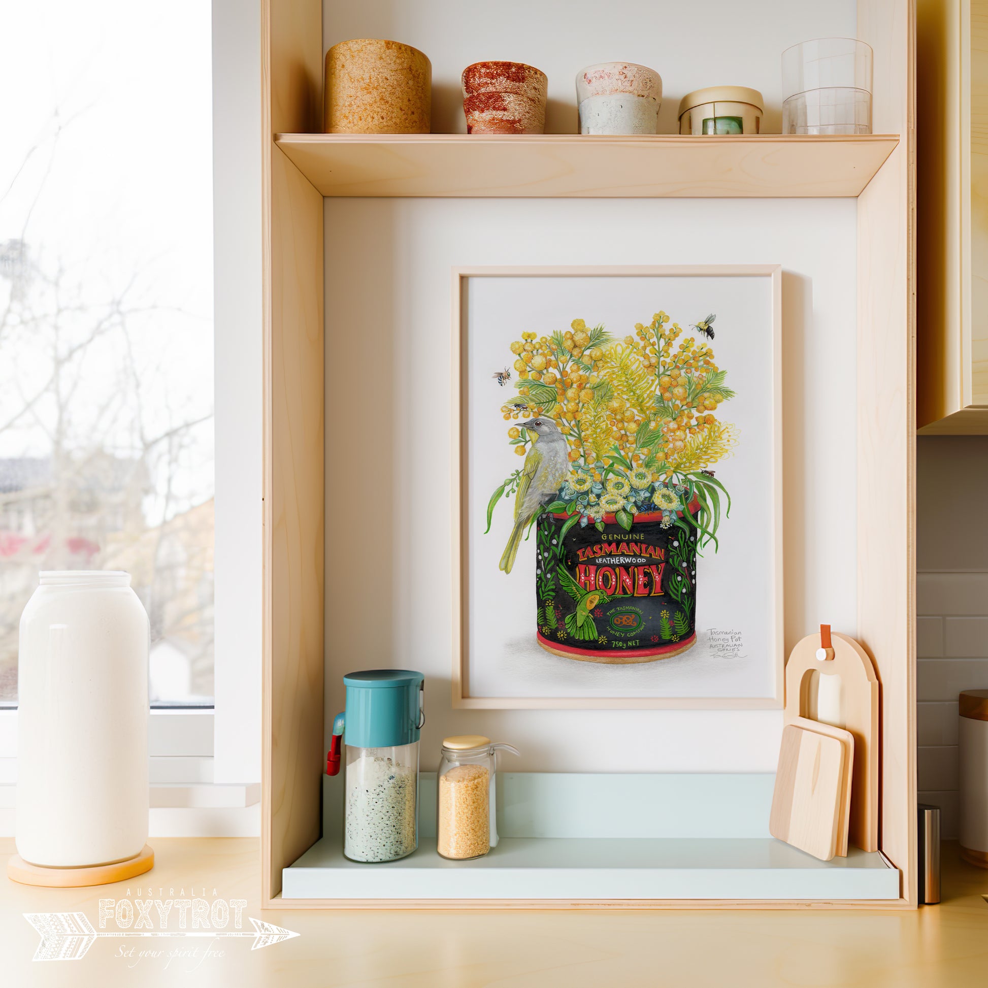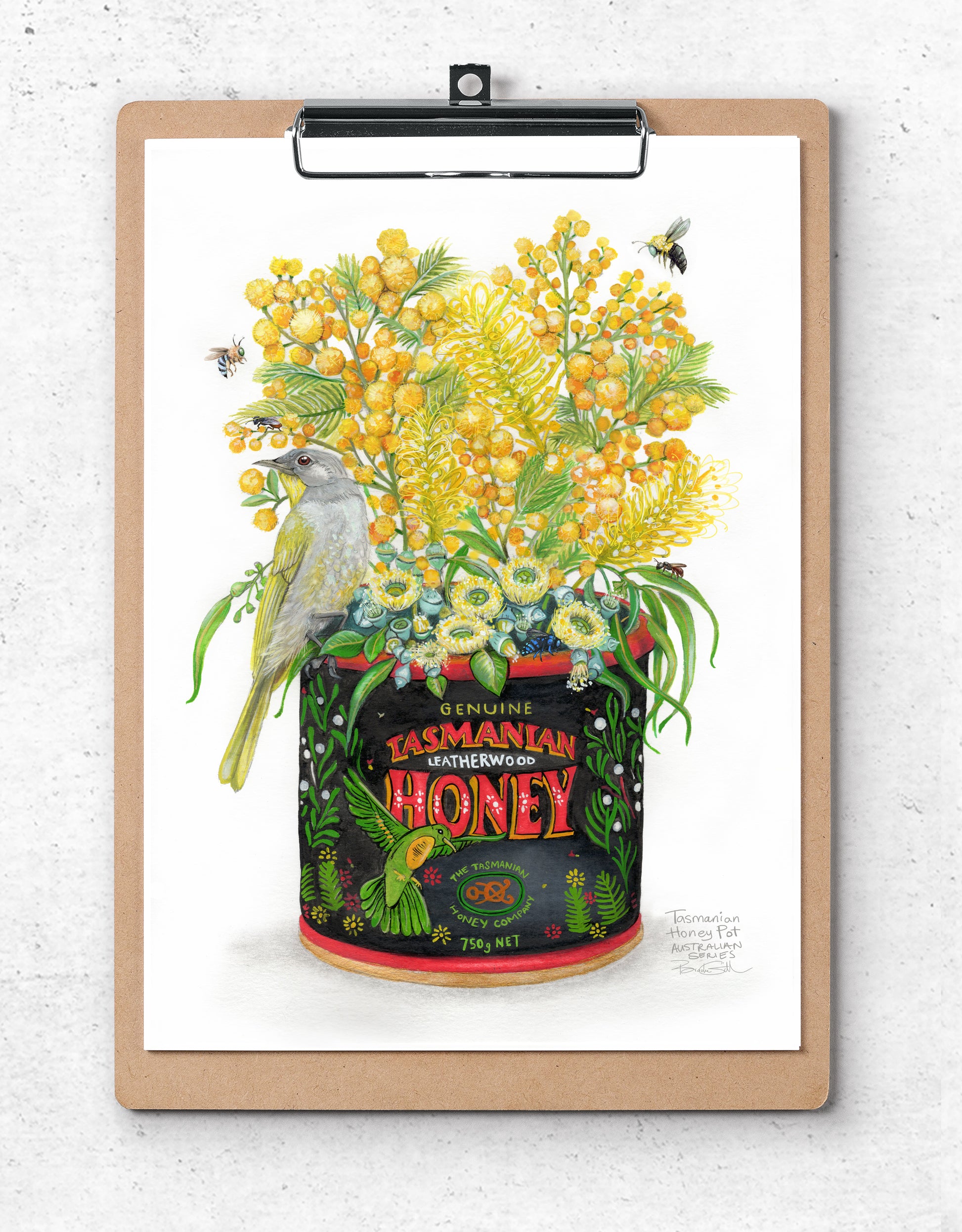 Tasmanian Leatherwood honey is naturally organic and collected from the bees that visit the western coast of Tasmania for the blooming flowers from the Leatherwood trees. The Yellow-throated Honeyeater is endemic to Tasmania. The Blue gum is Tasmania’s floral emblem. Silver Wattle (Acacia dealbata) is found throughout Tasmania and where there is honey, there are bees so keep an eye out for the five natives hovering around the wattle - Blue Banded Bee, Stingless Social Bee, Great Carpenter Bee, Cuckoo Bee and the Reed Bee.