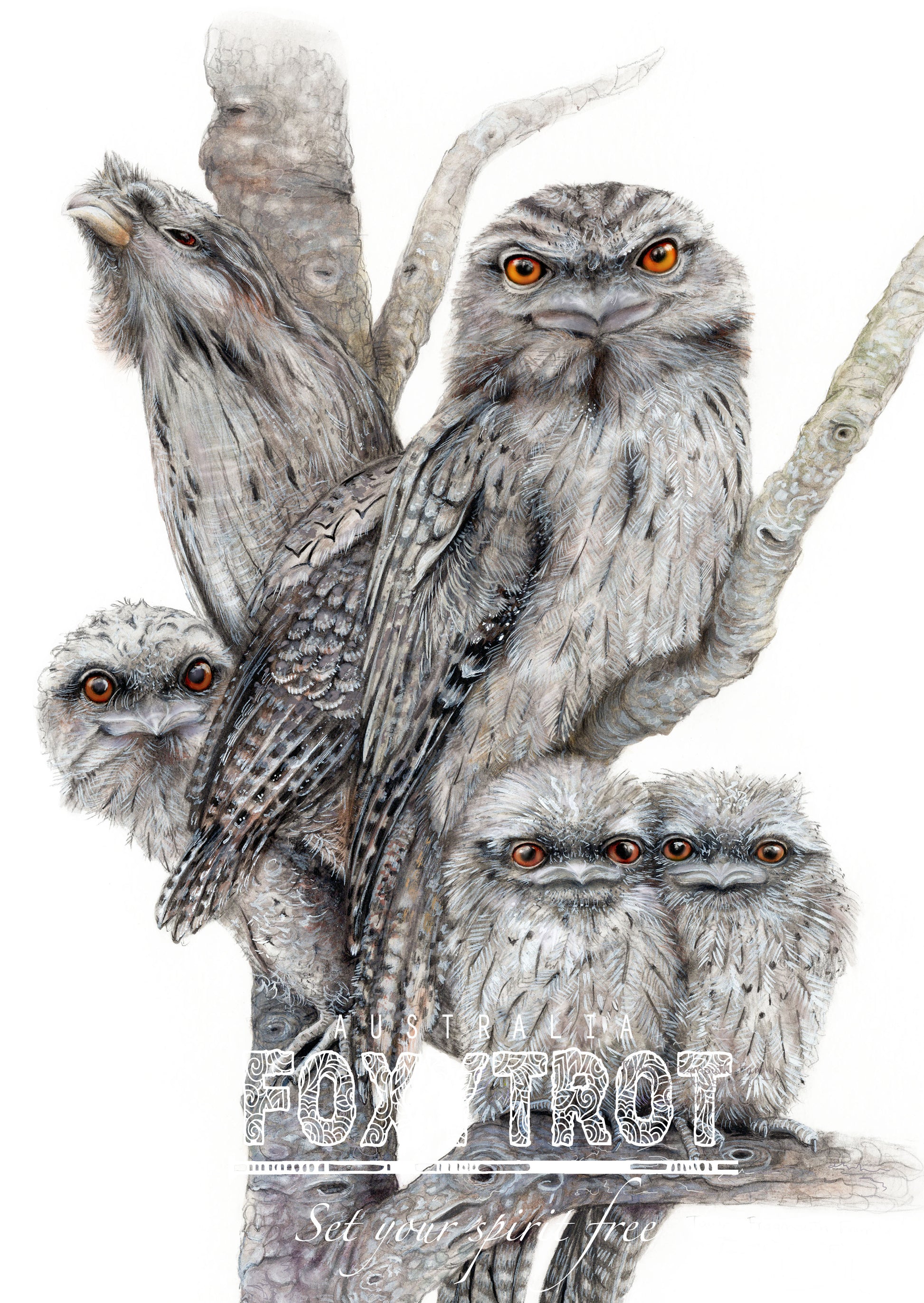 I created this piece with the thought that the main Tawny is mum, Dad has gone into camouflage mode posing as a tree branch and the kids are all looking very intrigued!