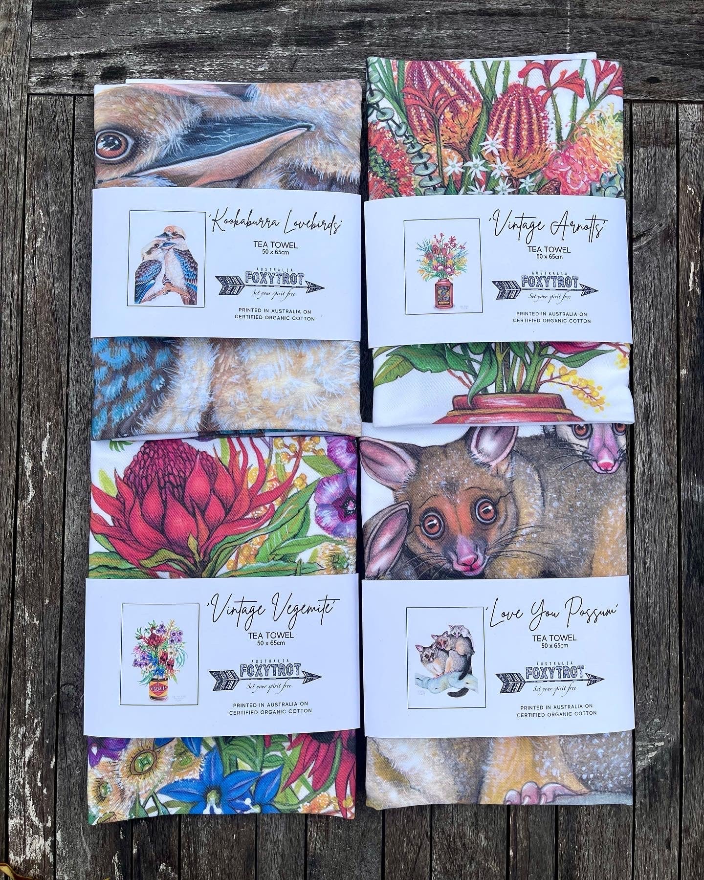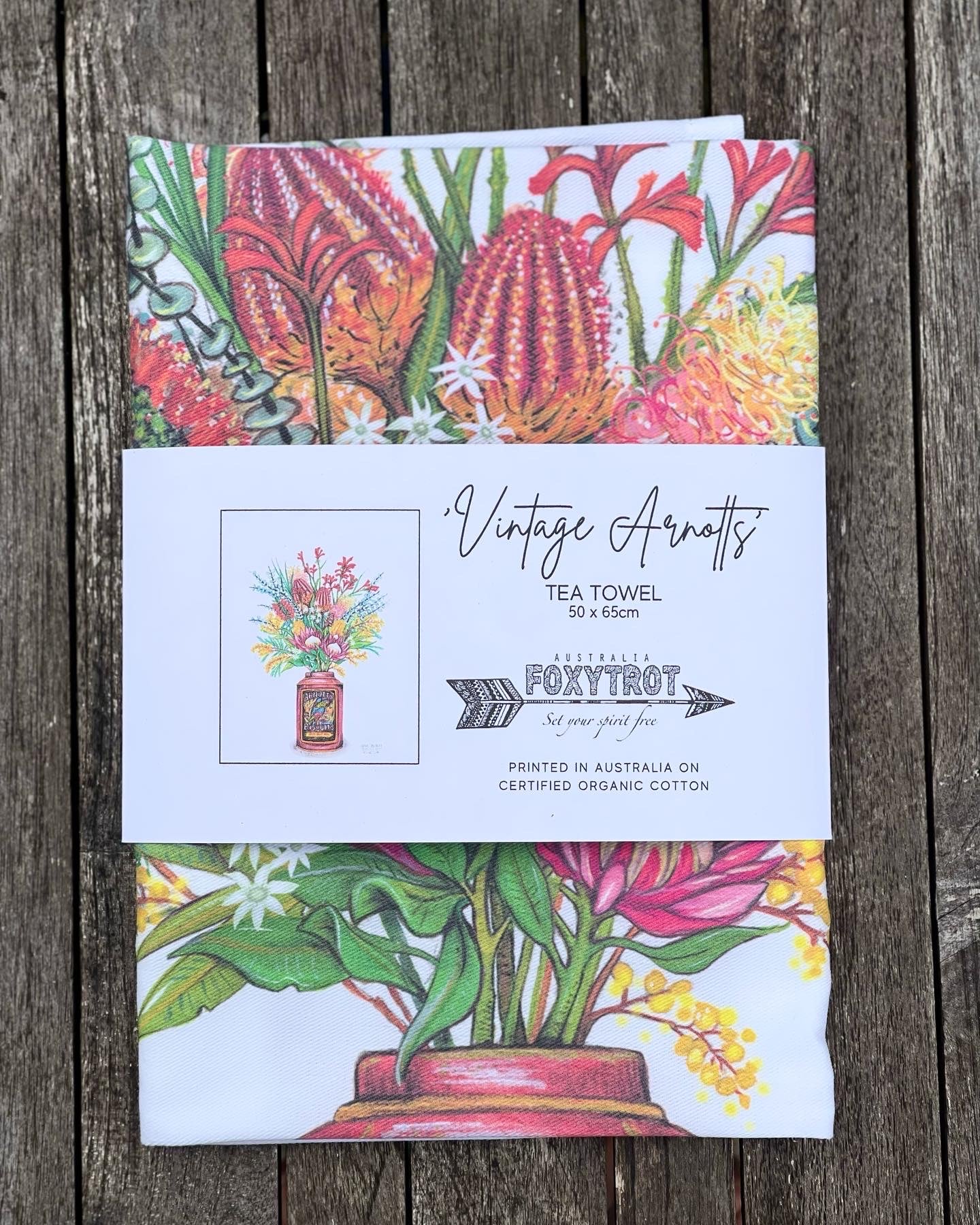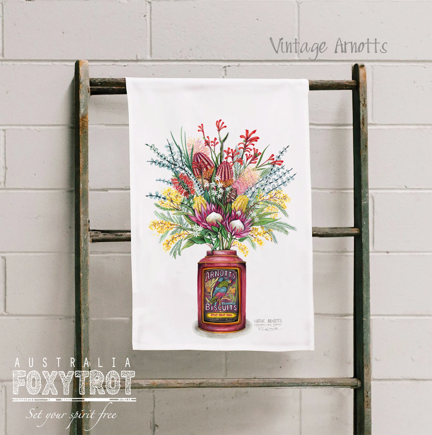 Welcome to my latest range of Certified Organic cotton tea towels, featuring my original watercolour artwork of the iconic Arnotts Biscuits tin as a vase filled with Native flowers of Australia.