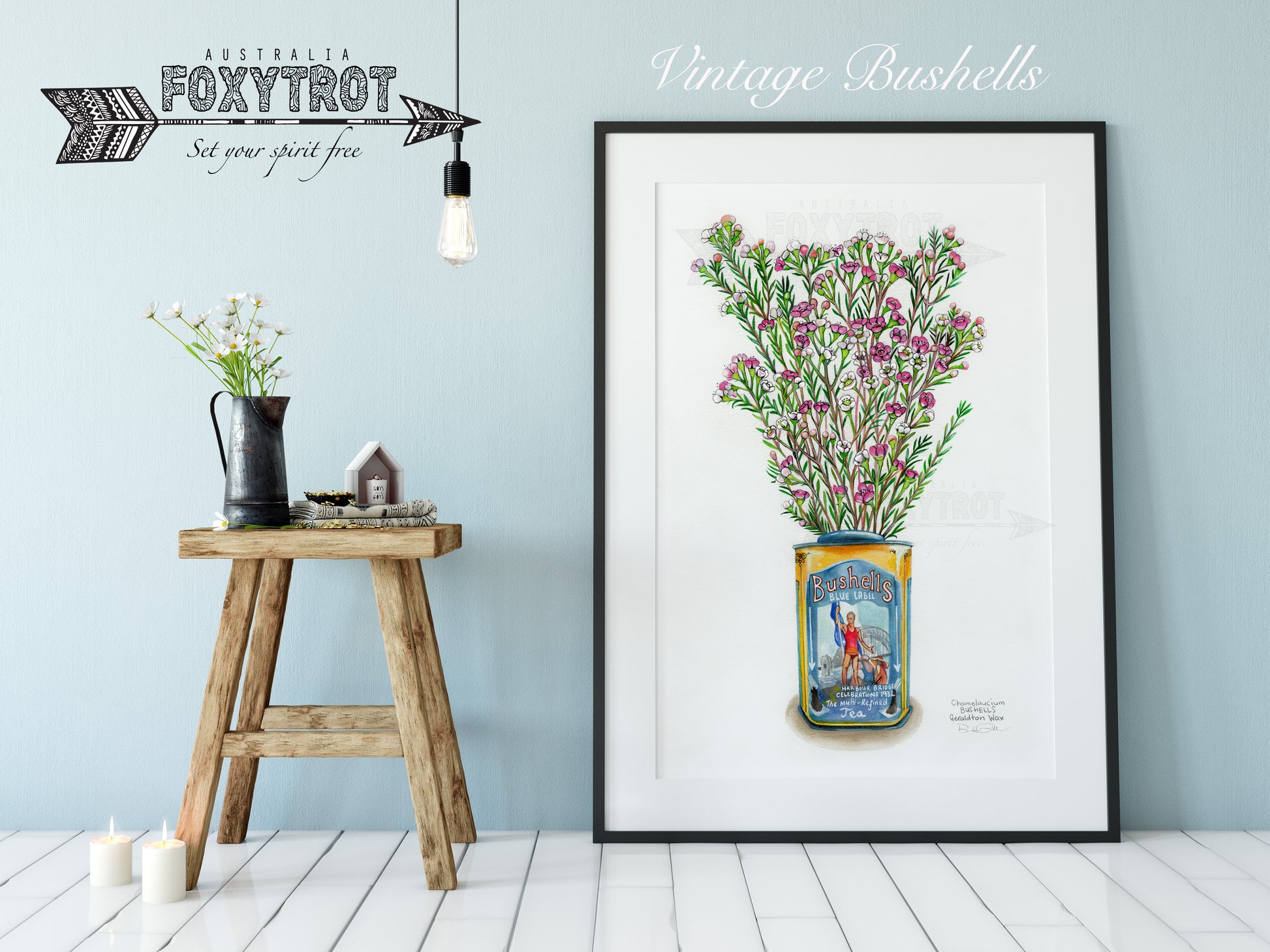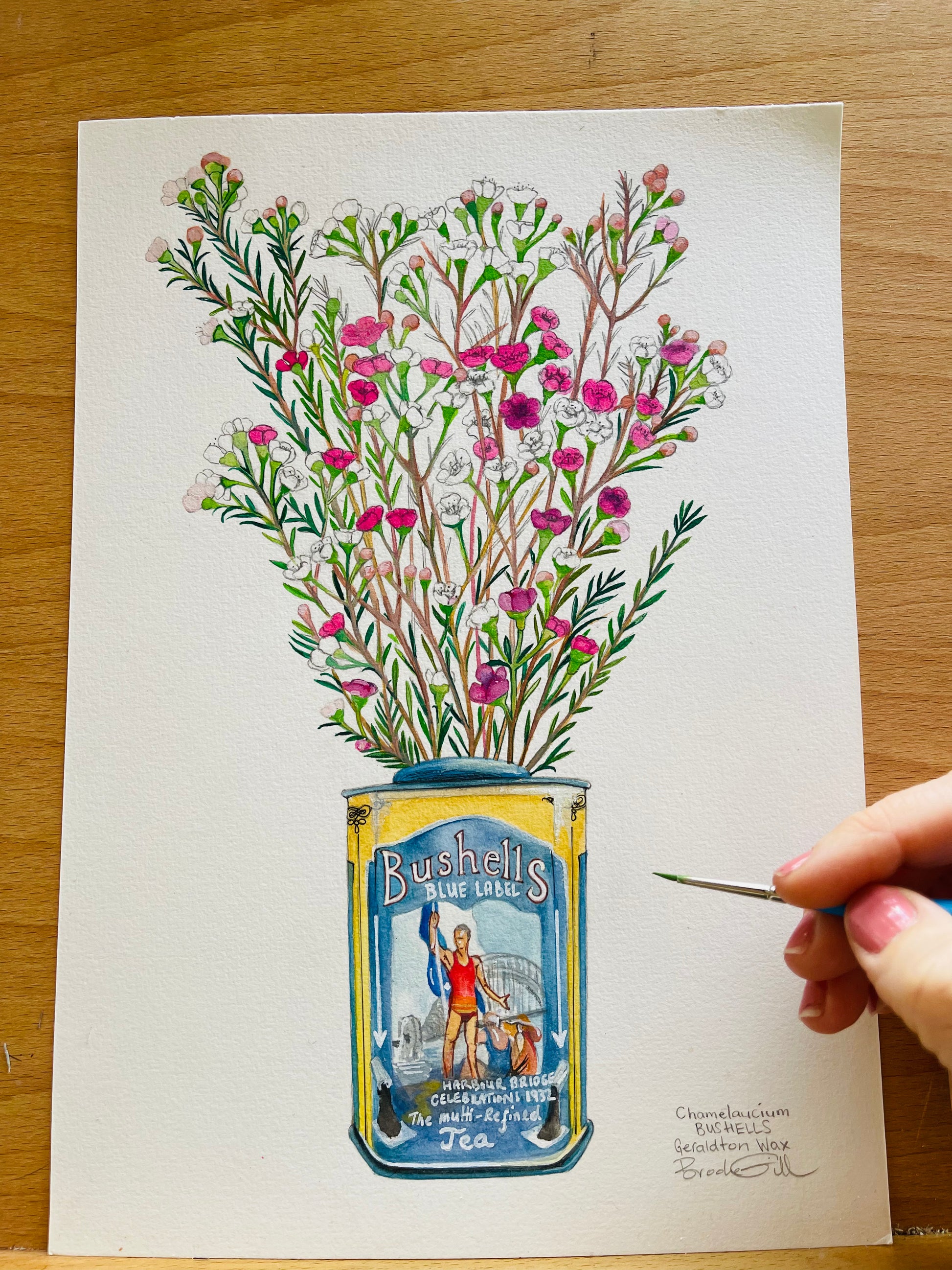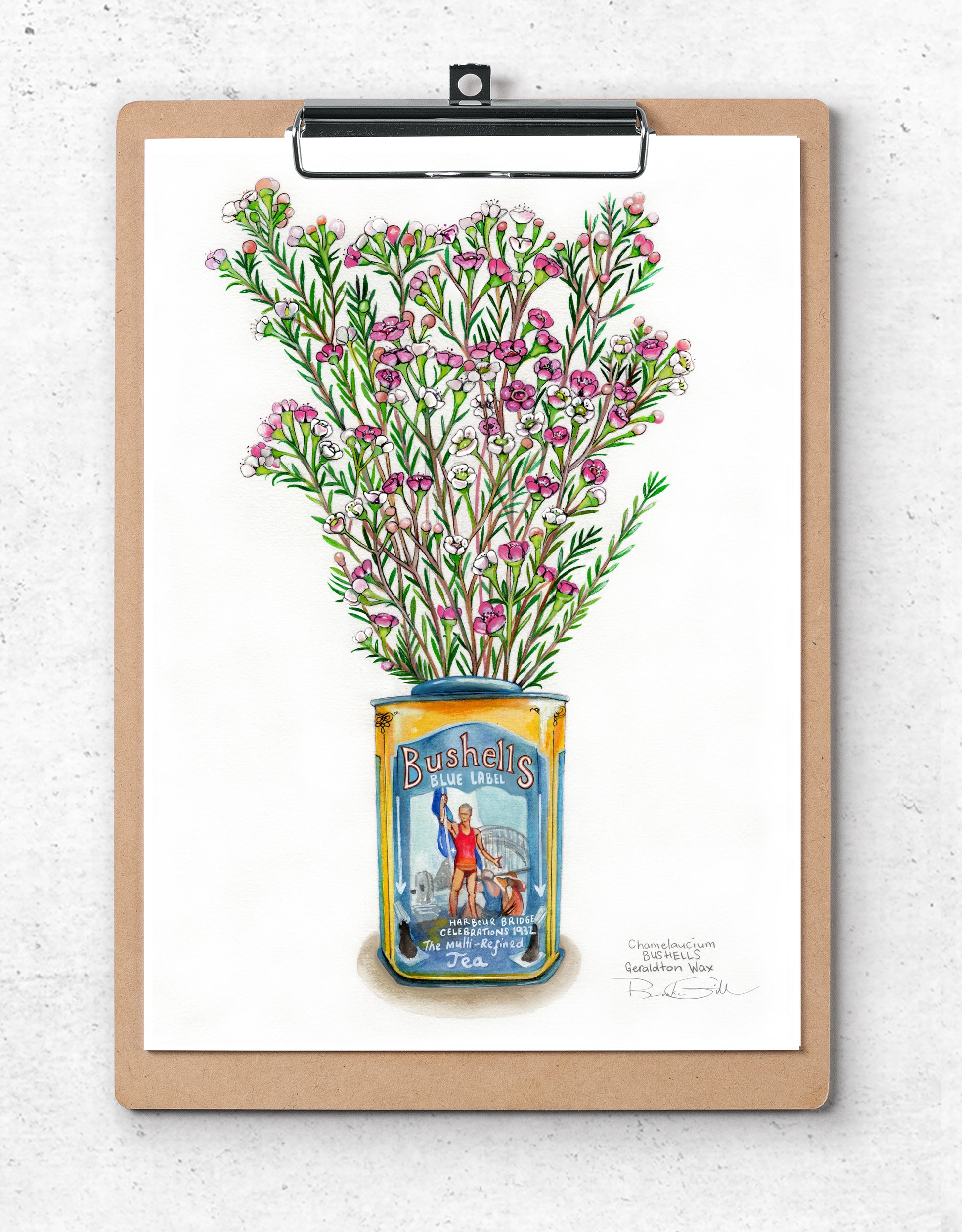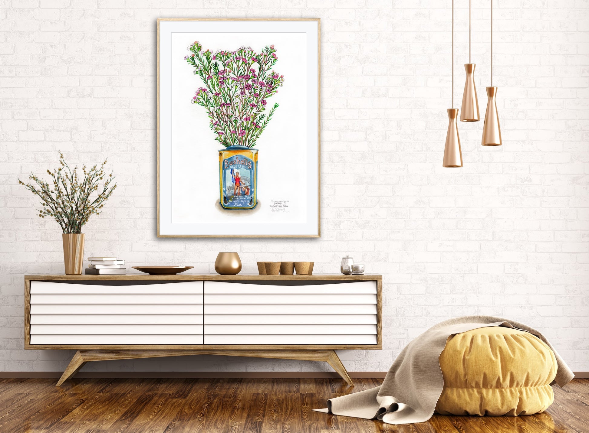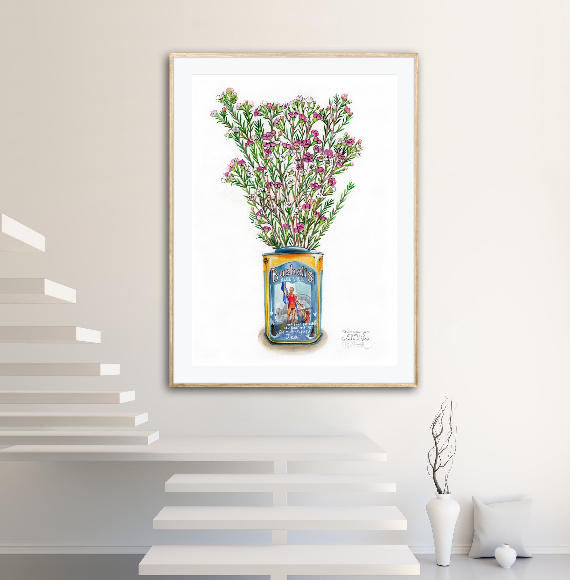 Chamelaucium Uncinatum - Geraldton Wax wildflowers in a 1932 Bushells Blue Label tin.