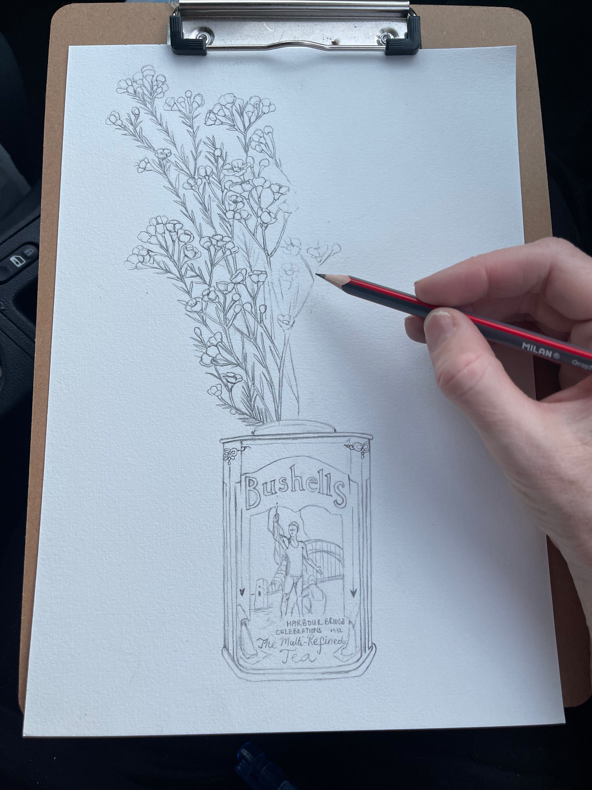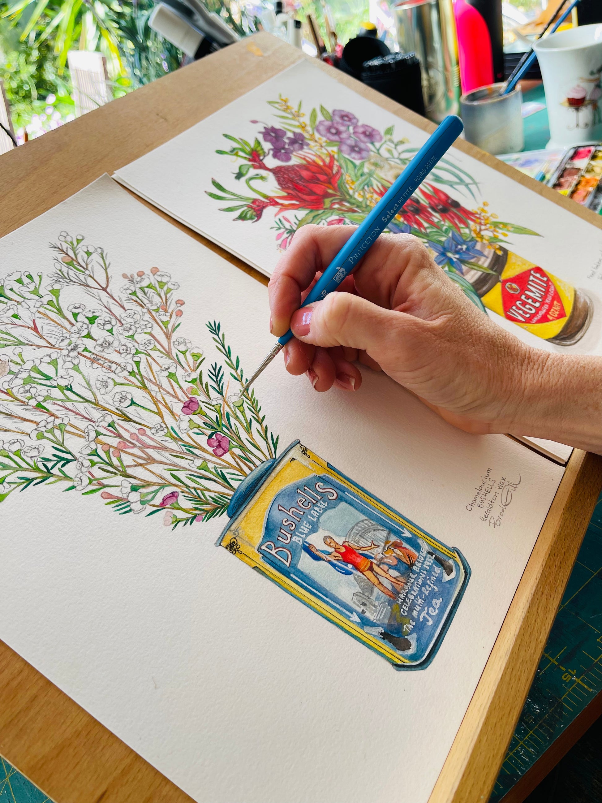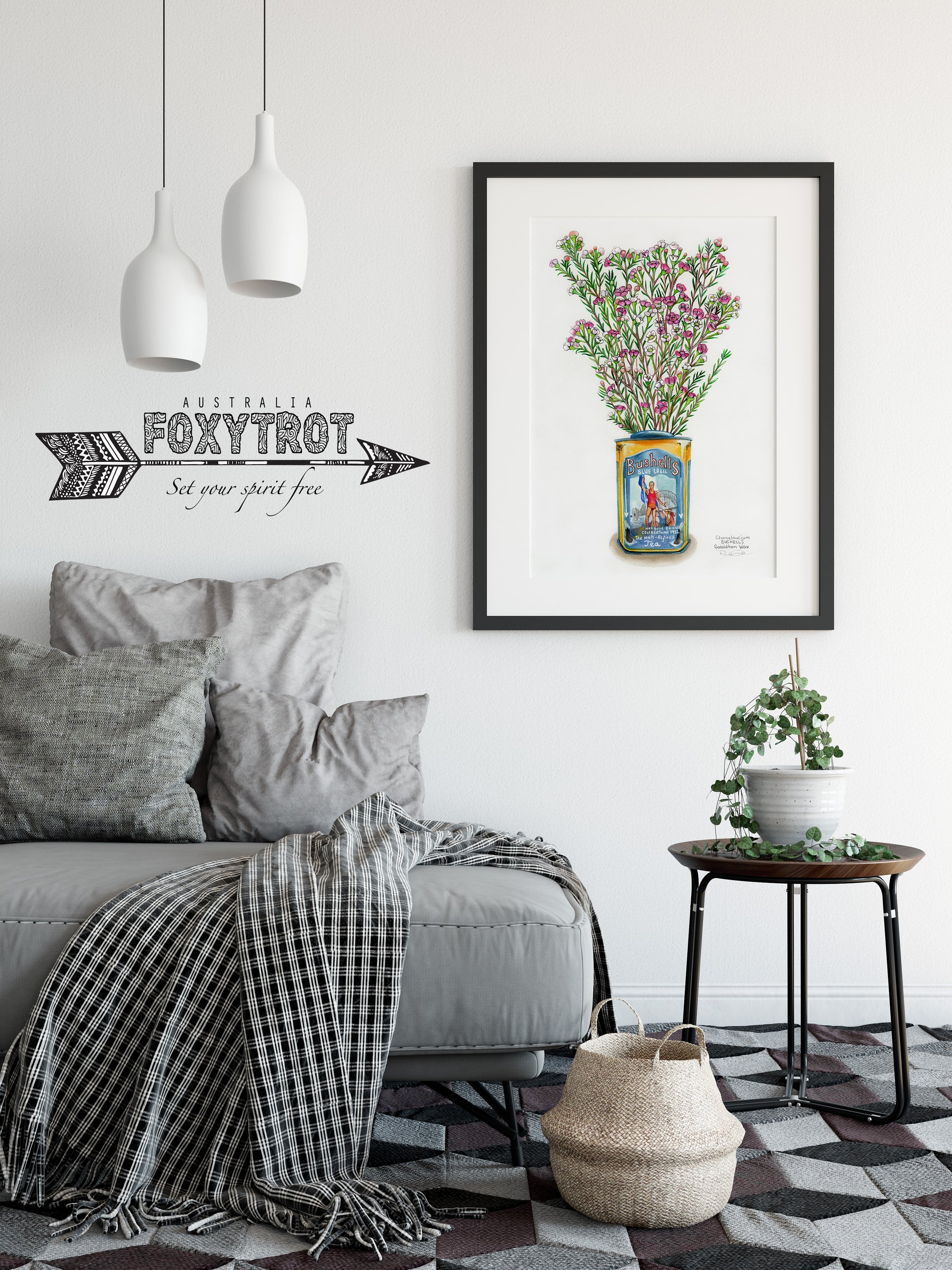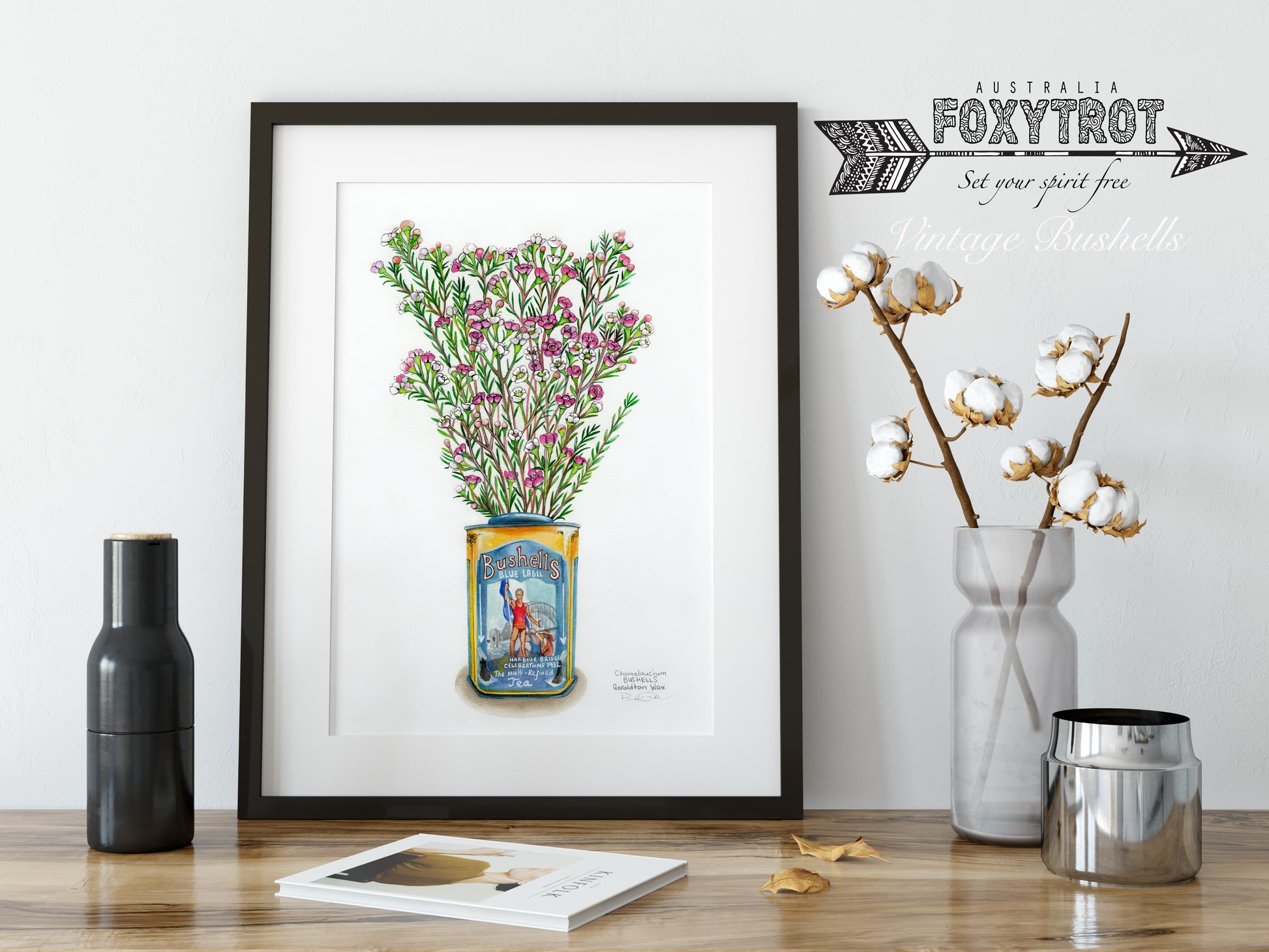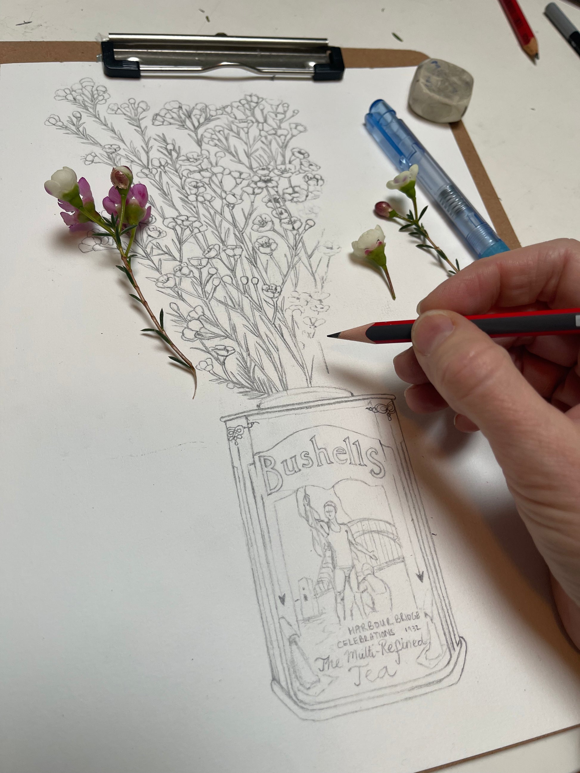 Chamelaucium Uncinatum - Geraldton Wax wildflowers in a 1932 Bushells Blue Label tin.