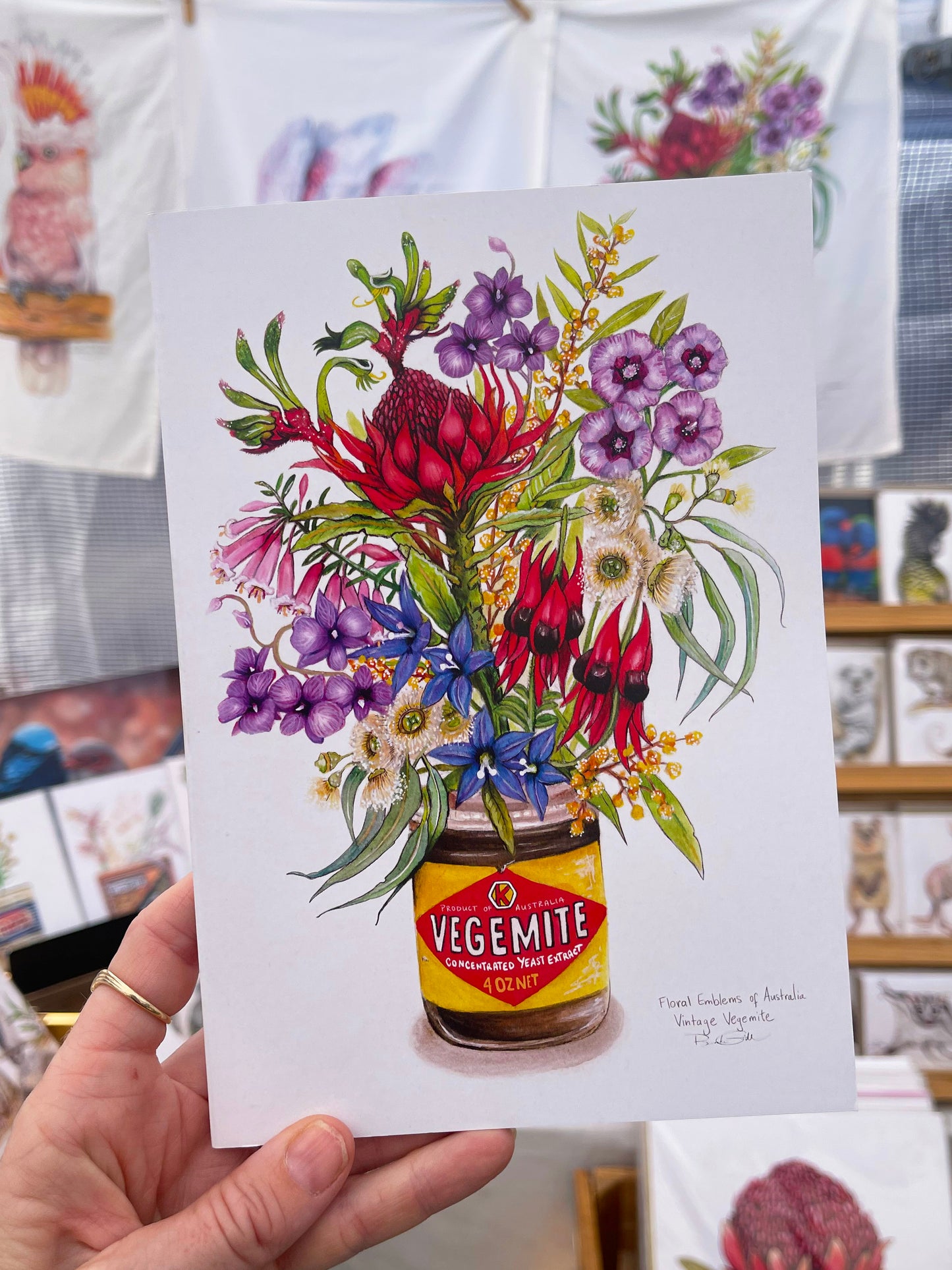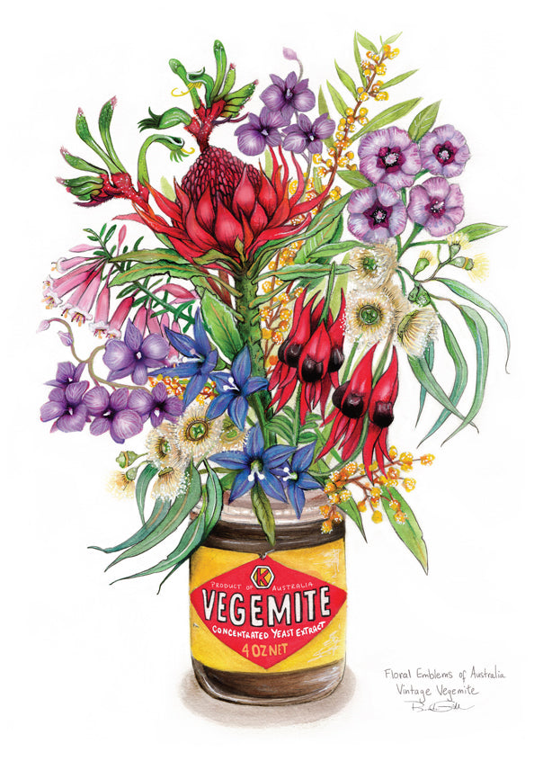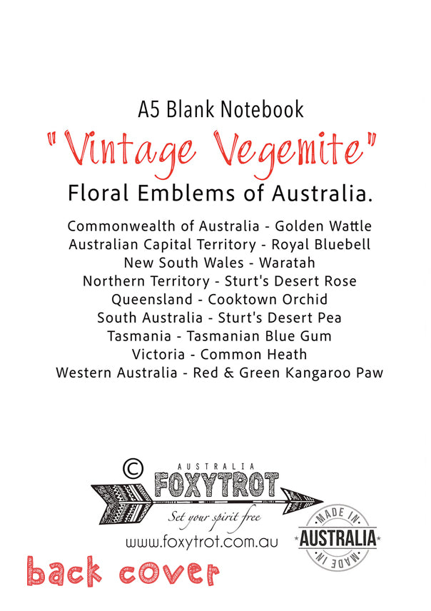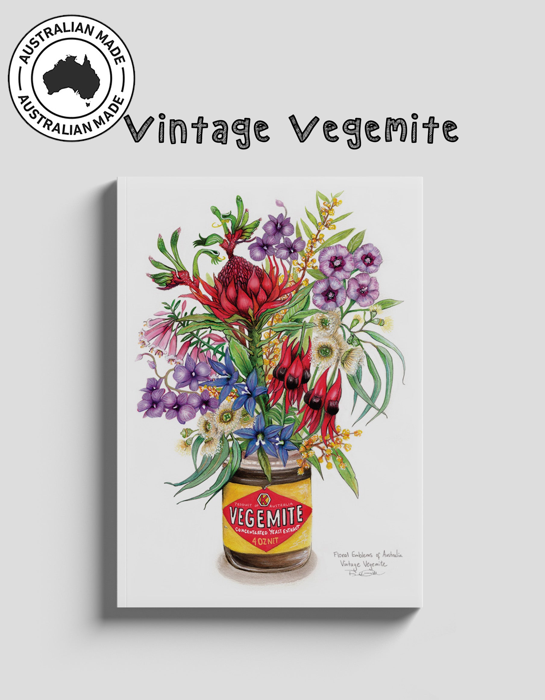 Be unique with this creative Vintage Vegemite jar noteboook with all the states of Australia, represented by their floral emblem. Illustrated by Brooke Lucy Gill.