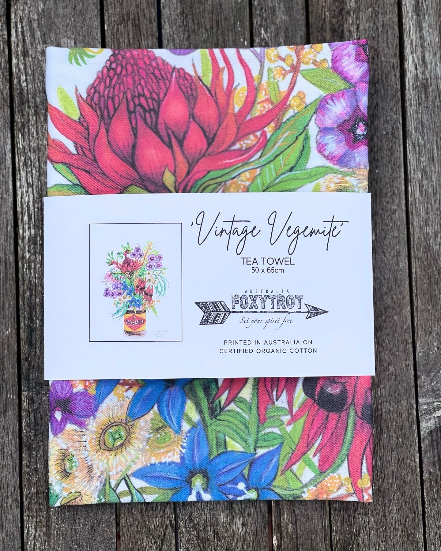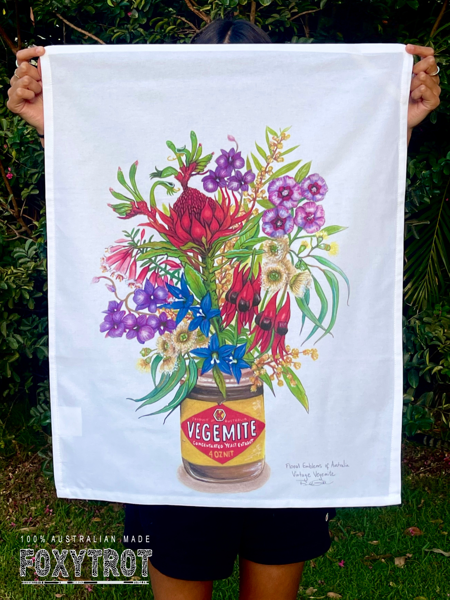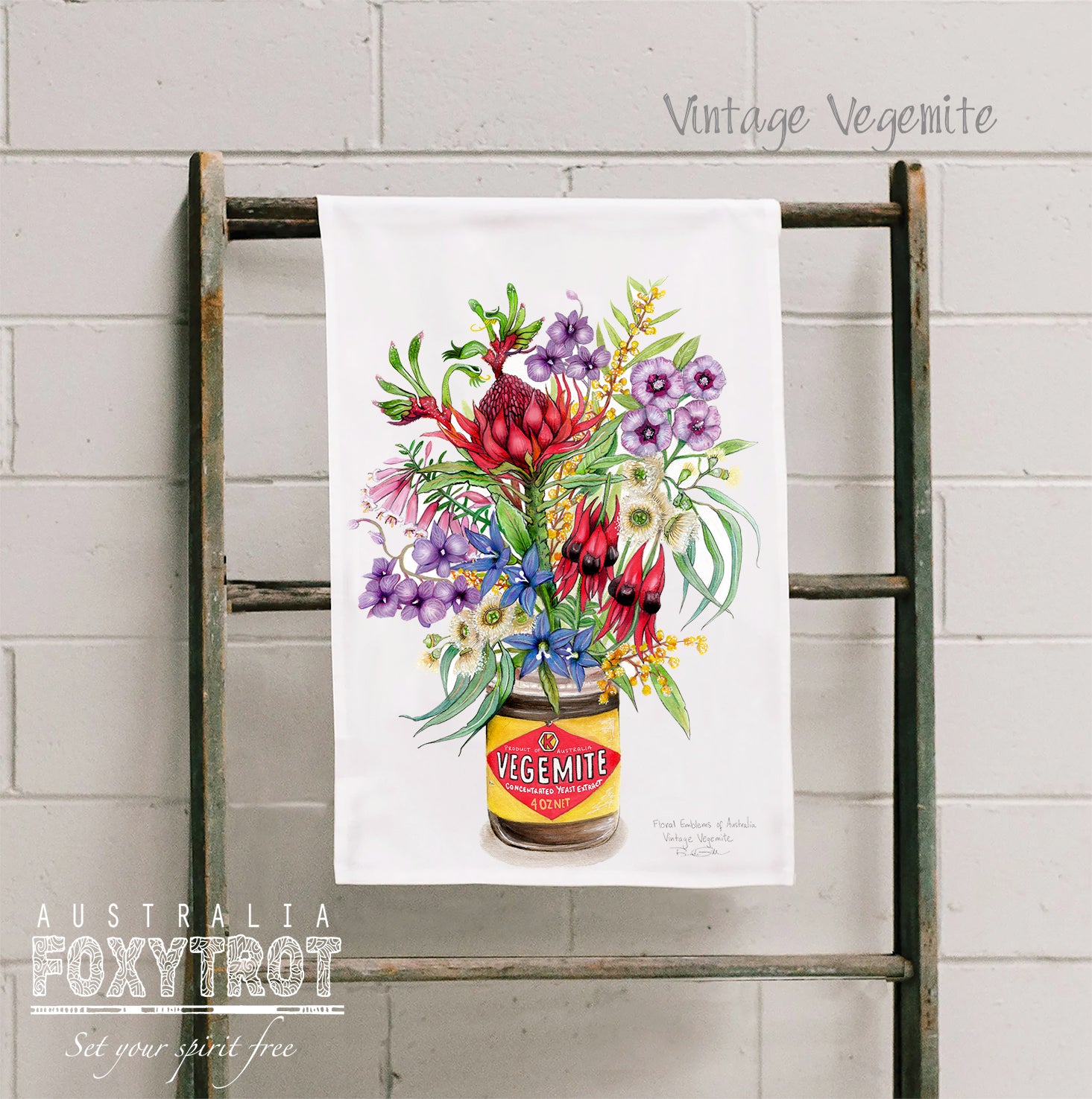Welcome to my latest range of Certified organic cotton tea towels, featuring my original watercolour artwork of the iconic Vegemite jar, with the floral state emblems of Australia.