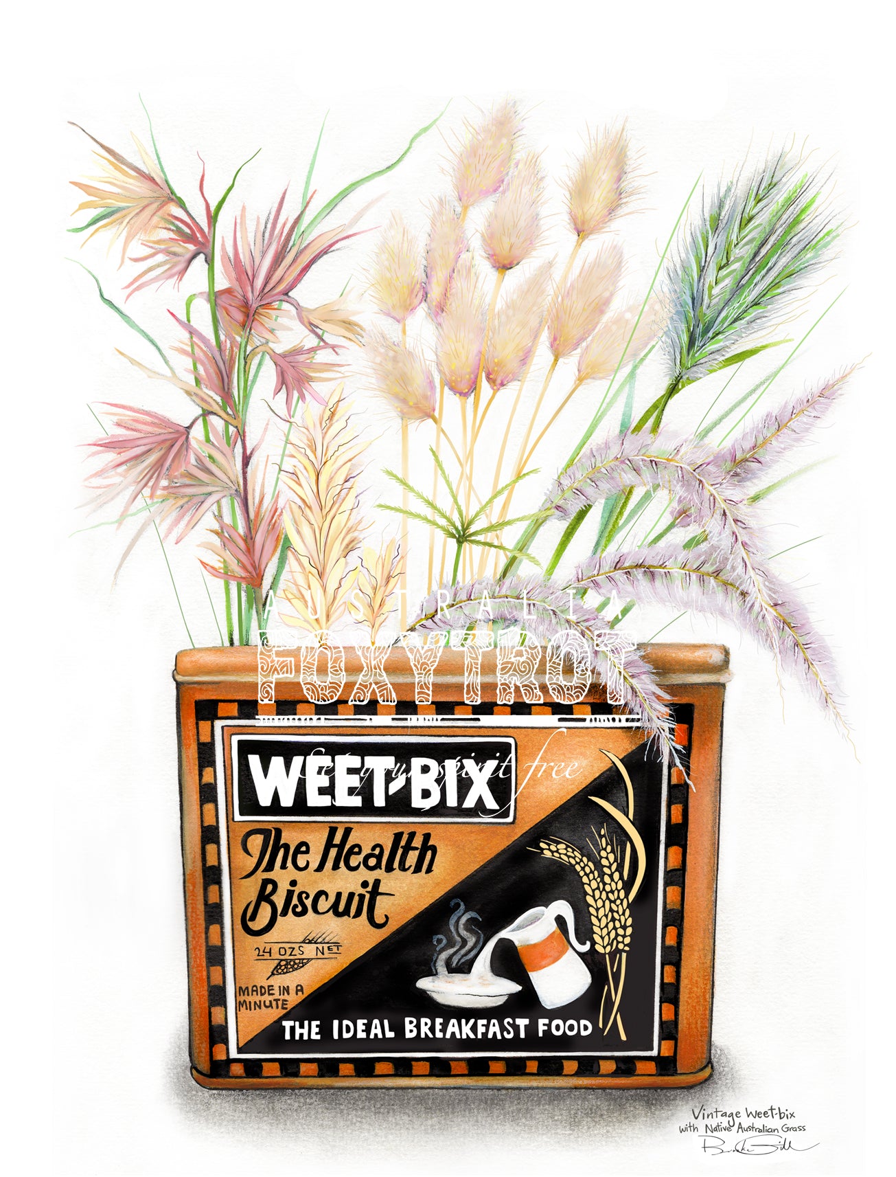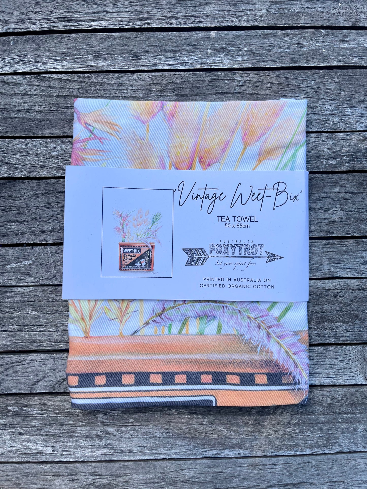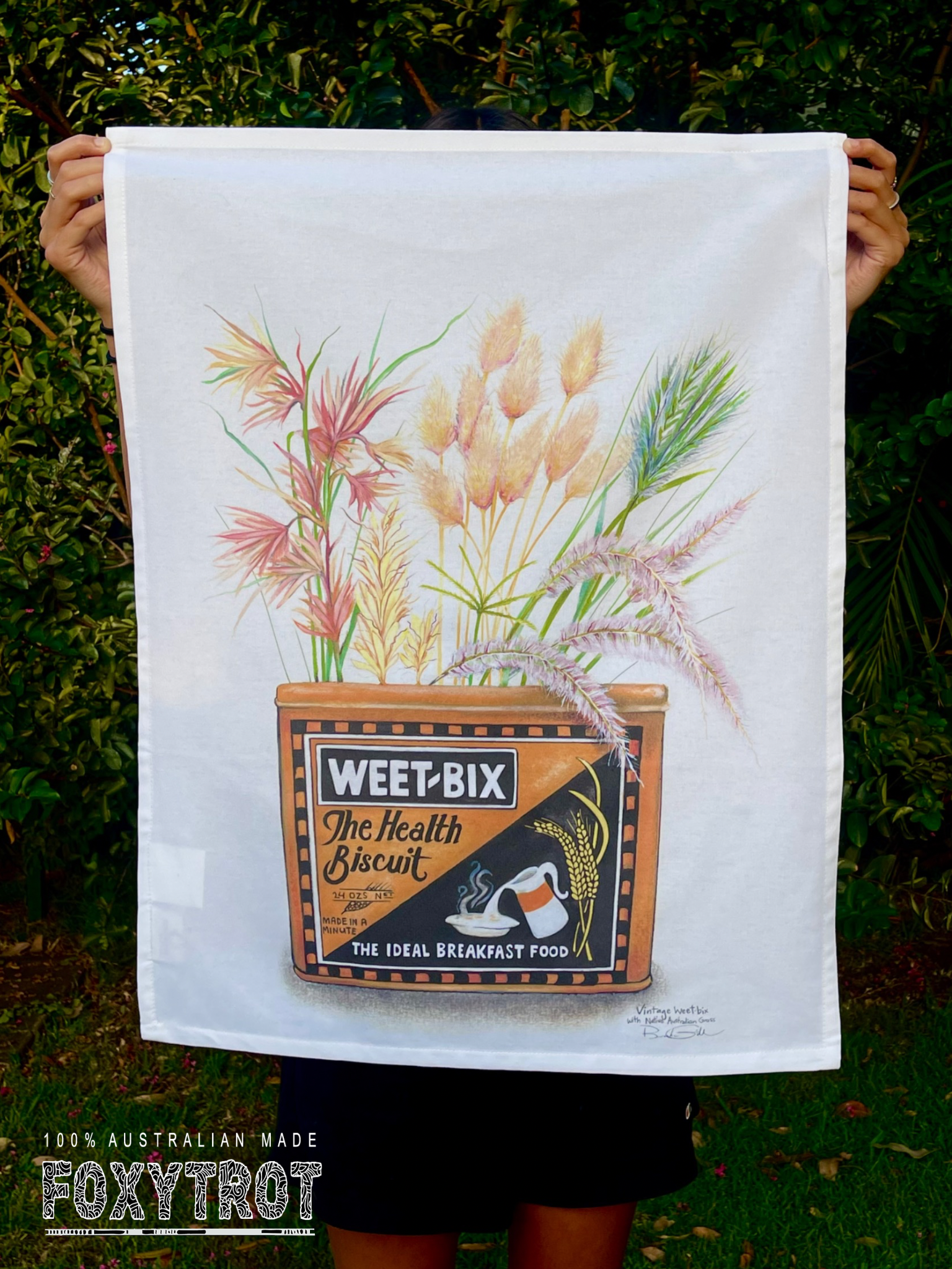Welcome to my latest range of Certified organic cotton tea towels, featuring my original watercolour artwork of an iconic Weet-bix tin, with native Australian grass flowing out the top.