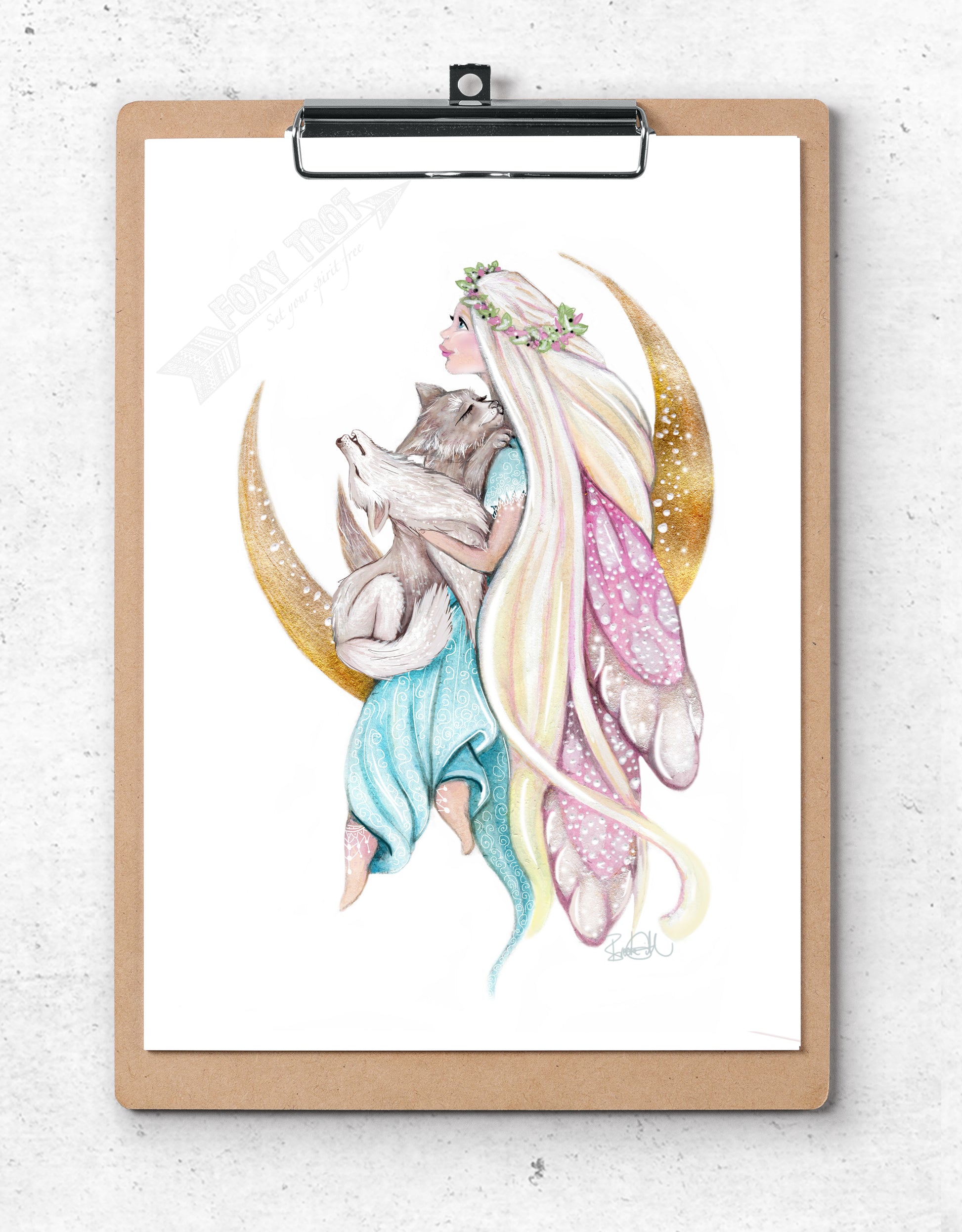 A slight edit to the original Wolf Cub Fairy illustration. For this piece I added another little wolf cub, making it so there was two cubs in her arms and I removed the flowers so they were all the main focus of the piece.